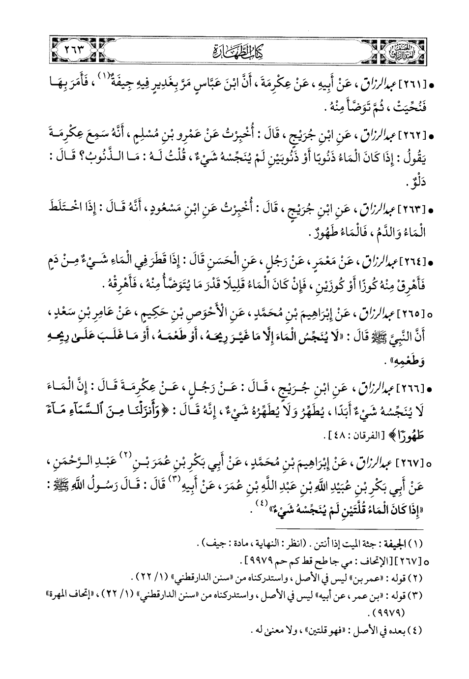 267- عبد الرزاق، عَن إِبرَاهِيمَ بْنِ مُحَمَّدٍ، عَنْ أَبِي بَكْرِ بْنِ عُمَرَ بْنِ عَبدِ الرَّحْمَنِ، عَنْ أَبِي بَكْرِ بْنِ عُبَيْدِ اللهِ بْنِ عَبدِ اللهِ بْنِ عُمَرَ، عَنْ أَبِيهِ، قَالَ: قَالَ رَسُولُ اللهِ صَلَّى اللهُ عَلَيْهِ وَسَلَّمَ: إِذَا كَانَ المَاءُ قُلَّتَيْنِ لَمْ يُنَجِّسْهُ شَيْءٌ.
