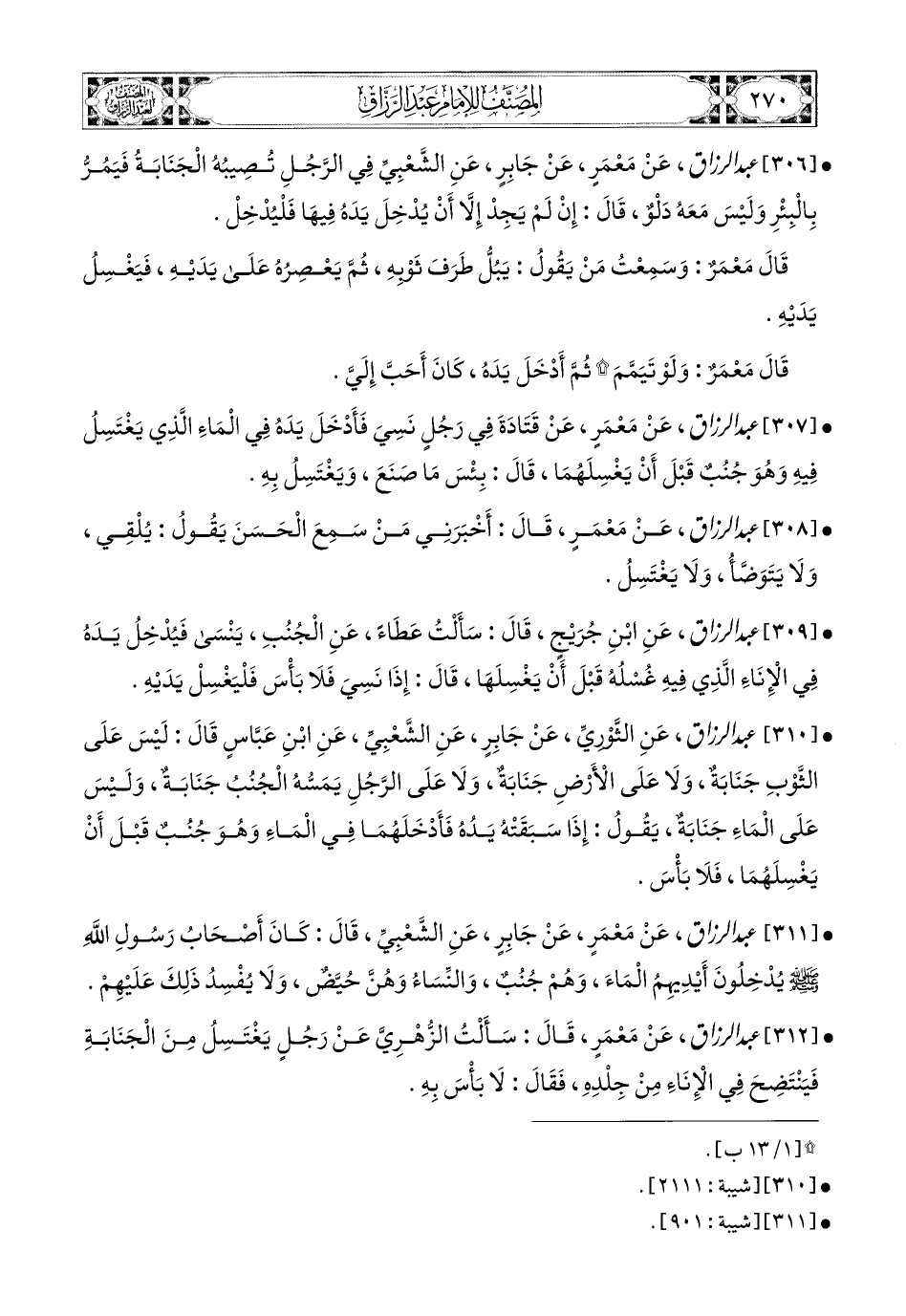 311- عبد الرزاق، عَنْ مَعْمَرٍ، عَن جَابِرٍ، عَنِ الشَّعْبِيِّ، قَالَ: كَانَ أَصْحَابُ رَسُولِ اللهِ صَلَّى اللهُ عَلَيْهِ وَسَلَّمَ يُدْخِلُونَ أَيْدِيَهُمُ المَاءَ وَهُمْ جُنُبٌ، وَالنِّسَاءُ وَهُنَّ حُيَّضٌ، وَلاَ يُفْسِدُ ذَلِكَ عَلَيْهِمْ.