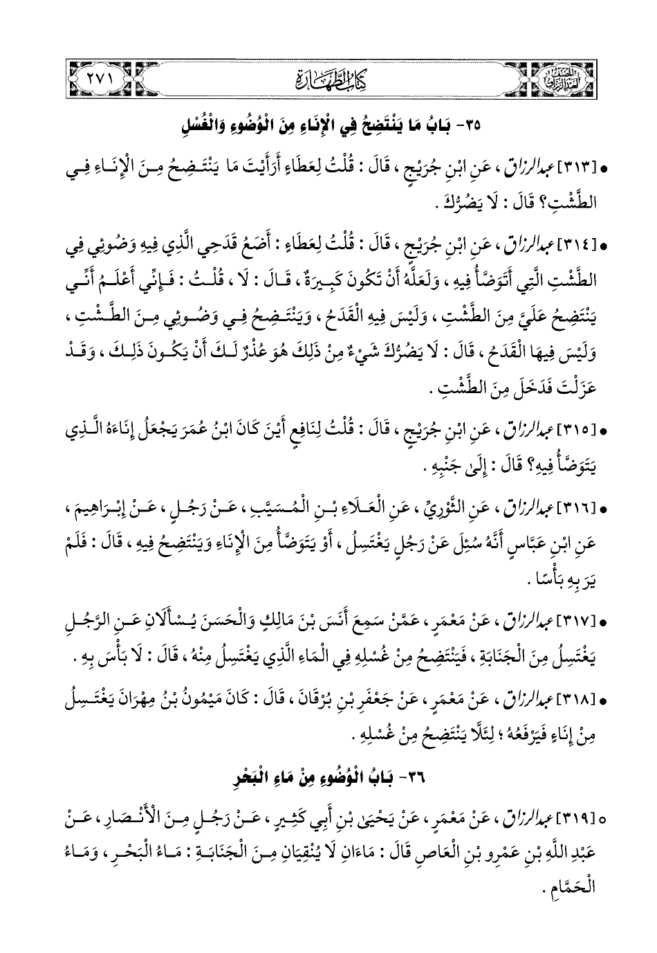 317- عبد الرزاق، عَنْ مَعْمَرٍ، عَمَّنْ سَمِعَ أَنَسَ بن مَالِكٍ، وَالْحَسَنَ يُسْأَلاَنِ عَنِ الرَّجُلِ يَغْتَسِلُ مِنَ الْجَنَابَةِ، فَيَنْتَضِحُ مِنْ غُسْلِهِ فِي المَاءِ الَّذِي يَغْتَسِلُ مِنْهُ، قَالَ: لاَ بَأْسَ بِهِ.