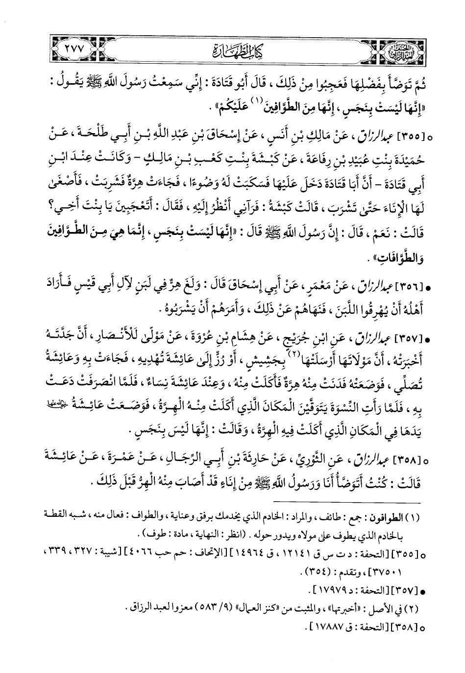 355- عبد الرزاق، عَنْ مَالِكِ بْنِ أَنَسٍ، عَن إِسْحَاقَ بْنِ عَبدِ اللهِ بْنِ أَبِي طَلْحَةَ، عَن حُمَيْدَةَ بِنْتِ عُبَيْدِ بْنِ رِفَاعَةَ، عَن كَبْشَةَ بِنْتِ كَعْبِ بْنِ مَالِكٍ، وَكَانَتْ عِنْدَ ابْنِ أَبِي قَتَادَةَ، أَنَّ أَبَا قَتَادَةَ دَخَلَ عَلَيْهَا فَسَكَبَتْ لَهُ وَضُوءًا، فَجَاءَتْ هِرَّةٌ فَشَرِبَتْ، فَأَصْغَى لَهَا الإِنَاءَ حَتَّى تَشْرَبَ، قَالَتْ كَبْشَةُ: فَرَآنِي أَنْظُرُ إِلَيْهِ، فَقَالَ: أَتَعْجَبِينَ يَا بِنْتَ أَخِي؟ قَالَتْ: نَعَمْ، قَالَ: إِنَّ رَسُولَ اللهِ صَلَّى اللهُ عَلَيْهِ وَسَلَّمَ قَالَ: إِنَّهَا لَيْسَتْ بِنَجَسٍ، إِنَّمَا هِيَ مِنَ الطَّوَّافِينَ وَالطَّوَّافَاتِ.