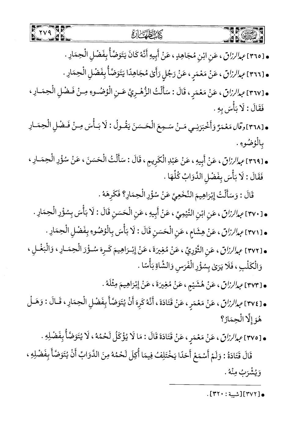 374- عبد الرزاق، عَنْ مَعْمَرٍ، عَن قَتَادَةَ، أَنَّهُ كَرِهَ أَنْ يُتَوَضَّأَ بِفَضْلِ الْحِمَارِ قَالَ: وَهَلْ هُوَ إِلاَّ الْحِمَارُ؟.