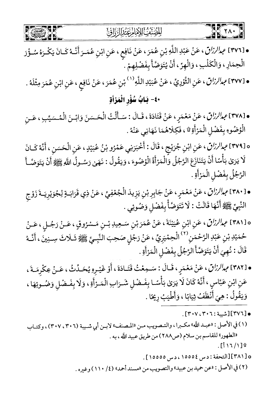 381- عبد الرزاق، عَنِ ابْنِ عُيَيْنَةَ، عَن عُمَرَ بْنِ سَعيدِ بْنِ مَسْرُوقٍ، عَن رَجُلٍ، عَن حُمَيْدِ بْنِ عَبدِ الرَّحْمَنِ الْحِمْيَرِيِّ، عَن رَجُلٍ صَحِبَ النَّبِيَّ صَلَّى اللهُ عَلَيْهِ وَسَلَّمَ ثَلاَثَ سِنِينَ، أَنَّهُ قَالَ: نُهِيَ أَنْ يَتَوَضَّأَ الرَّجُلُ بِفَضْلِ المَرْأَةِ.