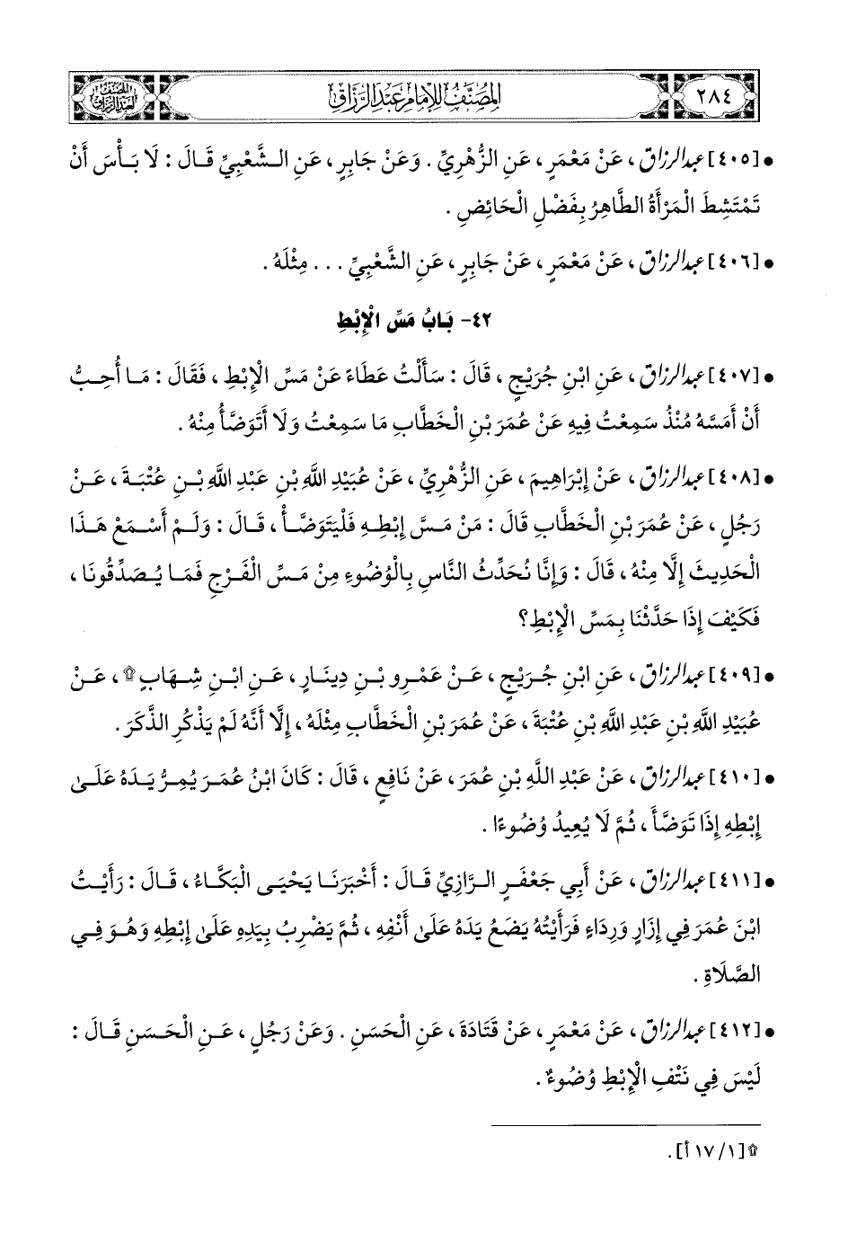 408- عبد الرزاق، عَن إِبرَاهِيمَ، عَنِ الزُّهْرِيِّ، عَن عُبَيْدِ اللهِ بْنِ عَبدِ اللهِ بْنِ عُتْبَةَ، عَن رَجُلٍ، عَن عُمَرَ بْنِ الْخَطَّابِ قَالَ: مَنْ مَسَّ إِبِطَهُ فَلْيَتَوَضَّأْ قَالَ: وَلَمْ أَسْمَعْ هَذَا الْحَدِيثَ إِلاَّ مِنْهُ قَالَ: وَإِنَّا نُحَدِّثُ النَّاسَ بِالْوُضُوءِ مِنْ مَسِّ الْفَرْجِ فَمَا يُصَدِّقُونَا فَكَيْفَ إِذَا حَدَّثْنَا بِمَسِّ الإِبْطِ؟.