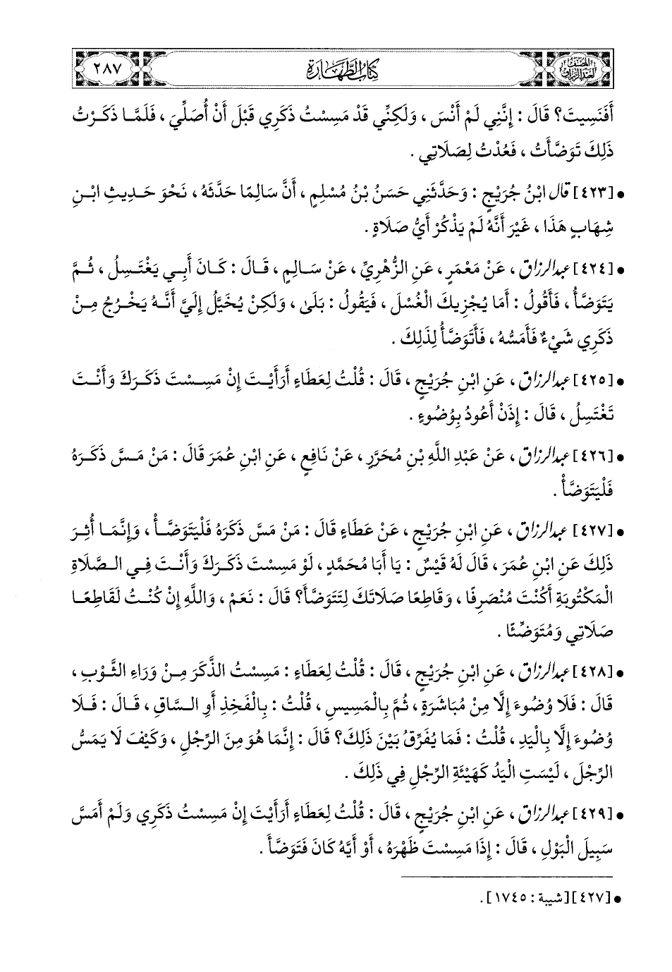 425- عبد الرزاق، عَنِ ابْنِ جُرَيْجٍ، قَالَ: قُلْتُ لِعَطَاءٍ: أَرَأَيْتَ إِنْ مَسِسْتَ ذَكَرَكَ وَأَنْتَ تَغْتَسِلُ؟ قَالَ: إِذًا أَعُودُ بِوُضُوءٍ.