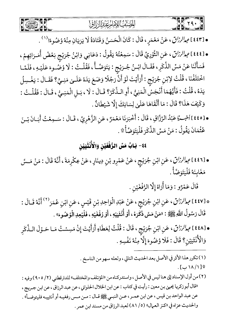 447- عبد الرزاق، عَنِ ابْنِ جُرَيْجٍ، عَنْ عبد الواحد بن قيس، عَنِ ابْنِ عُمَرَ (1)، أَنَّهُ قَالَ: قَالَ رَسُولُ اللهِ صَلَّى اللهُ عَلَيْهِ وَسَلَّمَ: مَنْ مَسَّ ذَكَرَهُ، أَوْ أُنْثَيَيْهِ، أَوْ رُفْغَيْهِ فَلْيُعِدِ الْوُضُوءَ.