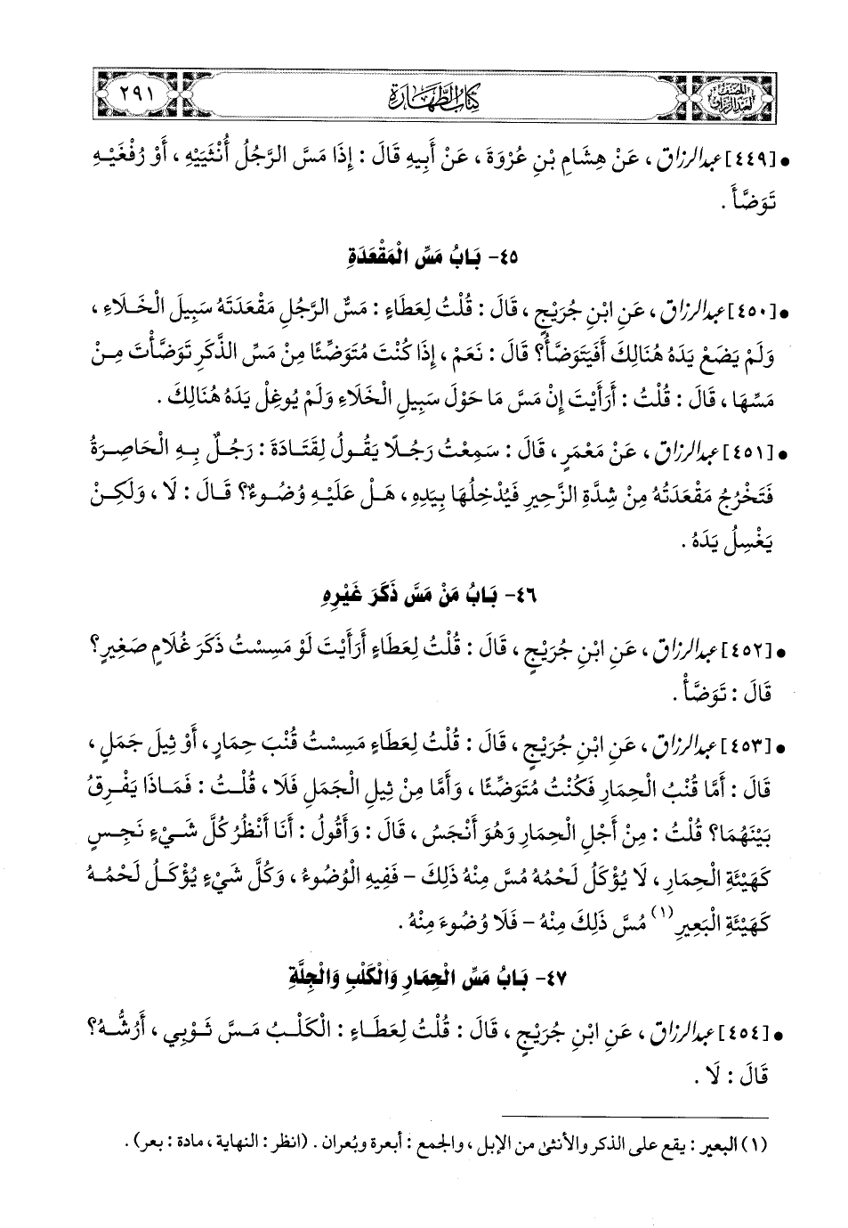 450- عبد الرزاق، عَنِ ابْنِ جُرَيْجٍ، قَالَ: قُلْتُ لِعَطَاءٍ: مَسُّ الرَّجُلُ مِقْعَدَتَهُ سَبِيلَ الْخَلاَءِ وَلَمْ يَضَعْ يَدَهُ هُنَالكَ أَفَيَتَوَضَّأُ؟ قَالَ: نَعَمْ، إِذَا كُنْتَ مُتَوَضِّئًا مِنْ مَسِّ الذَّكَرِ تَوَضَّأْتَ مِنْ مَسِّهَا قَالَ: قُلْتُ: أَرَأَيْتَ إِنْ مَسَّ مَا حَوْلَ سَبِيلِ الْخَلاَءِ وَلَمْ يُوغِلْ يَدَهُ هُنَالِكَ.