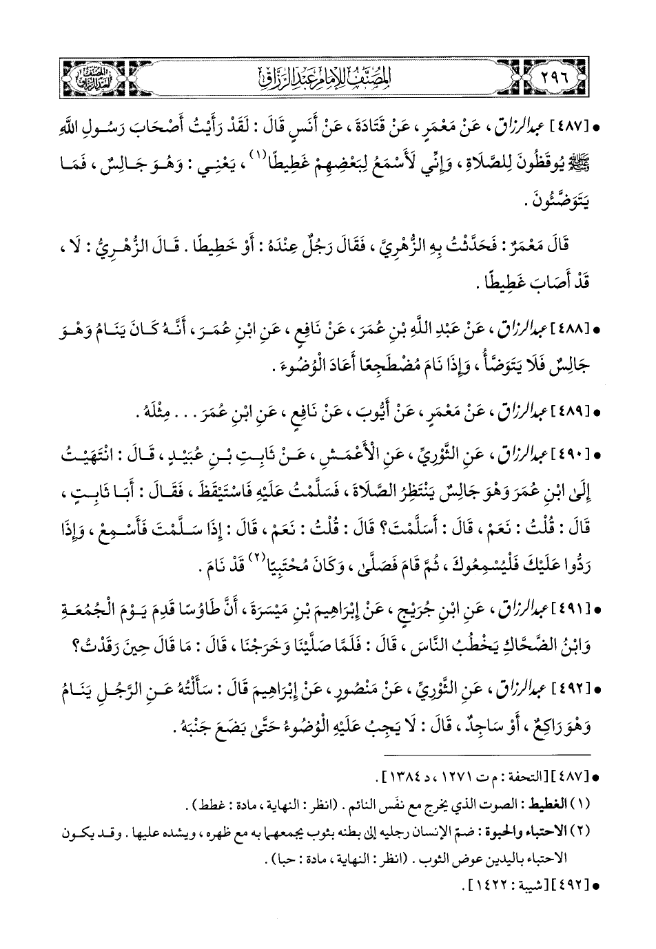 487- عبد الرزاق، عَنْ مَعْمَرٍ، عَن قَتَادَةَ، عَنْ أَنَسٍ قَالَ: لَقَدْ رَأَيْتُ أَصْحَابَ رَسُولِ اللهِ صَلَّى اللهُ عَلَيْهِ وَسَلَّمَ يُوقَظُونَ لِلصَّلاَةِ، وَإِنِّي لأَسْمَعُ لِبَعْضِهِمْ غَطِيطًا، يَعْنِي وَهُوَ جَالِسٌ، فَمَا يَتَوَضَّؤُونَ.