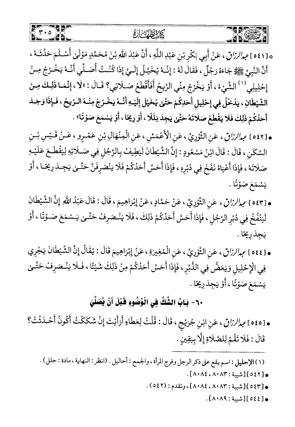 541- عبد الرزاق، عَنْ أَبِي بَكْرِ بْنِ عَبدِ اللهِ، أَنَّ عَبدَ اللهِ بن مُحَمَّدٍ، مَوْلَى أَسْلَمَ حَدَّثَهُ، أَنَّ النَّبِيَّ صَلَّى اللهُ عَلَيْهِ وَسَلَّمَ جَاءَهُ رَجُلٌ، فَقَالَ لَهُ: إِنَّهُ يُخَيَّلُ إِلَيَّ إِذَا كُنْتُ أُصَلِّي أَنَّهُ يَخْرُجُ مِنْ إِحْلِيلِي الشَّيْءُ، أَوْ يَخْرُجُ مِنِّي الرِّيحُ، أَفَأَقْطَعُ صَلاَتِي؟ قَالَ: لاَ، إِنَّمَا ذَلِكَ مِنَ الشَّيْطَانِ، يَدْخُلُ فِي إِحْلِيلِ أَحَدِكُمْ، حَتَّى يُخَيَّلَ إِلَيْهِ أَنَّهُ يَخْرُجُ مِنْهُ الرِّيحُ، فَإِذَا وَجَدَ أَحَدُكُمْ ذَلِكَ فَلاَ يَقْطَعْ صَلاَتَهُ حَتَّى يَجِدَ بَلَلاً، أَوْ رِيحًا، أَوْ يَسْمَعَ صَوْتًا.