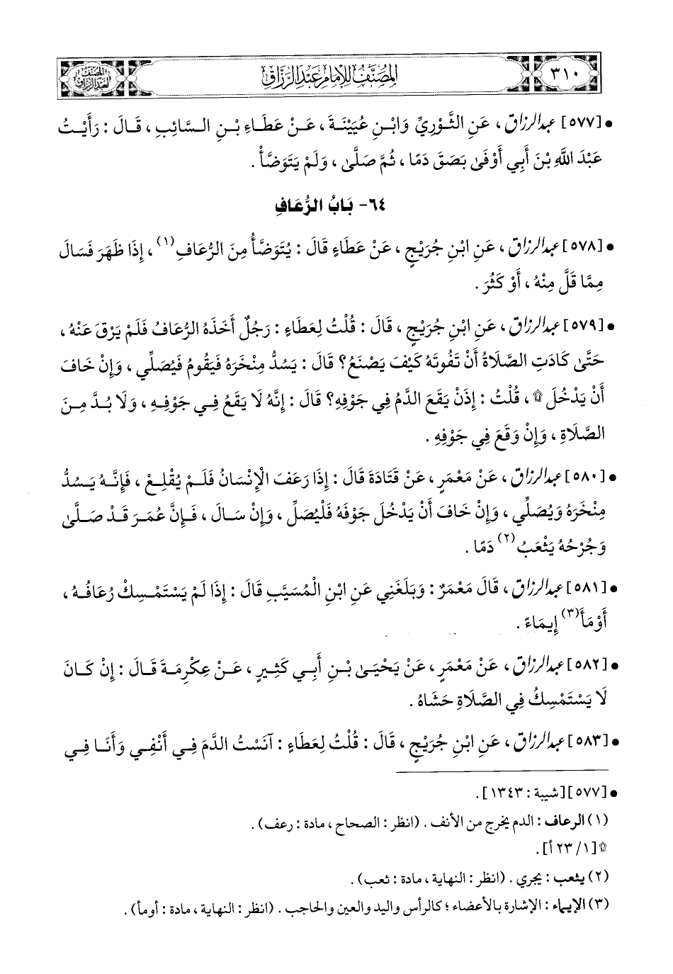 580- عبد الرزاق، عَنْ مَعْمَرٍ، عَن قَتَادَةَ، قَالَ: إِذَا رَعَفَ الإِنْسَانُ فَلَمْ يُقْلِعْ، فَإِنَّهُ يَسُدُّ مِنْخَرَهُ وَيُصَلِّي، وَإِنْ خَافَ أَنْ يَدْخُلَ جَوْفَهُ فَلْيُصَلِّ، وَإِنْ سَالَ فَإِنَّ عُمَرَ قَدْ صَلَّى وَجُرْحُهُ يَثْعَبُ دَمًا.