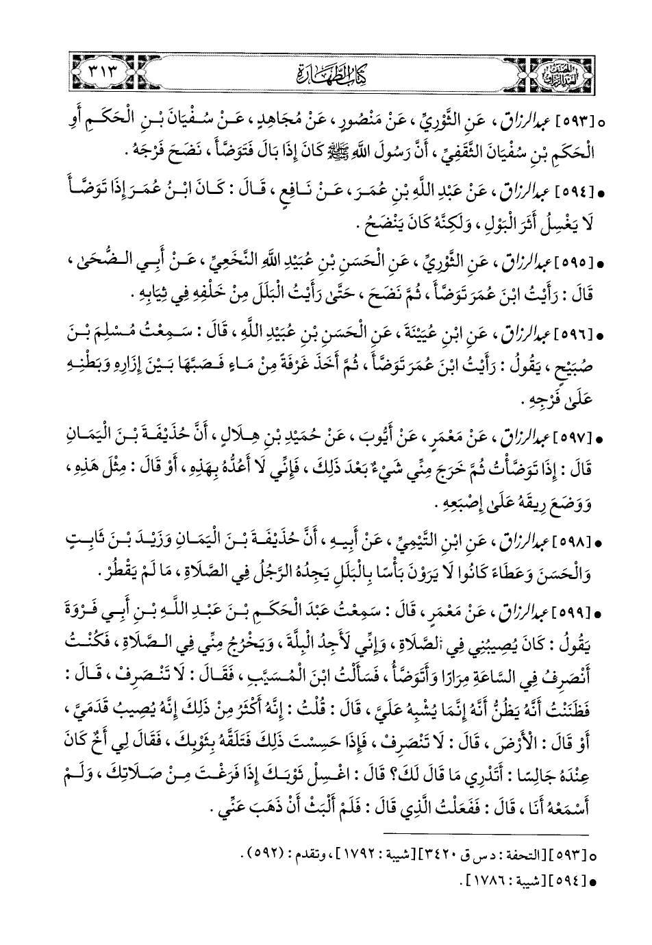 593- عبد الرزاق، عَنِ الثَّورِيِّ، عَنْ مَنصُورٍ، عَن مُجاهِدٍ، عَن سُفْيَانَ بْنِ الْحَكَمِ، أَوِ الْحَكَمِ بْنِ سُفْيَانَ الثَّقَفِيِّ، أَنَّ رَسُولَ اللهِ صَلَّى اللهُ عَلَيْهِ وَسَلَّمَ كَانَ إِذَا بَالَ فَتَوَضَّأَ نَضَحَ فَرْجَهُ.