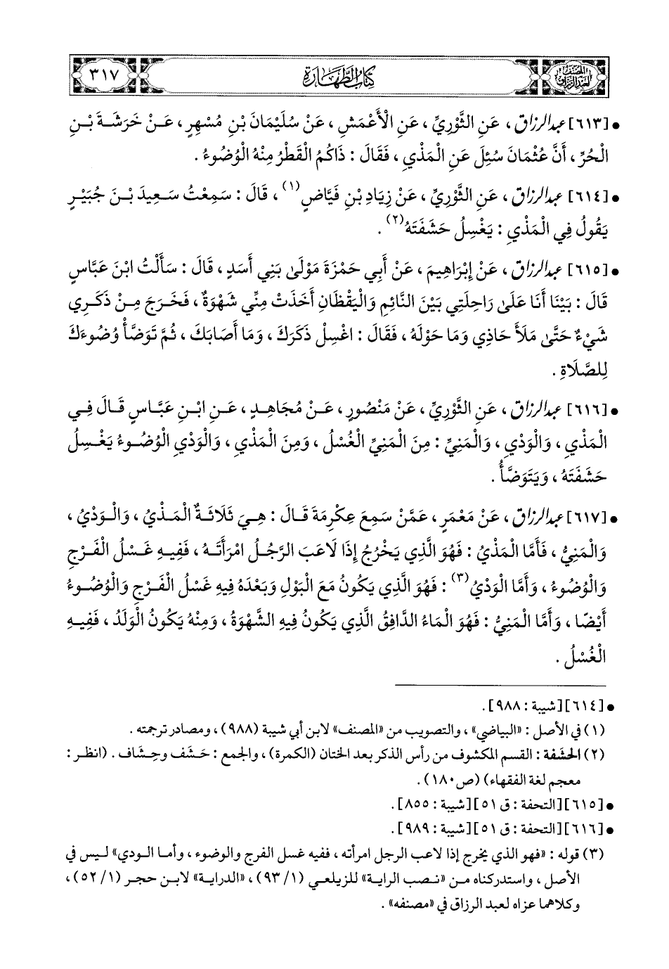 613- عبد الرزاق، عَنِ الثَّورِيِّ، عَنِ الأَعمَشِ، عَن سُلَيْمَانَ بْنِ مُسْهِرٍ، عَن خَرَشَةَ بْنِ الْحُرِّ، أَنَّ عُثْمَانَ سُئِلَ عَنِ المَذْيِ، فَقَالَ: ذَاكُمُ الْقَطْرُ مِنْهُ الْوُضُوءُ.