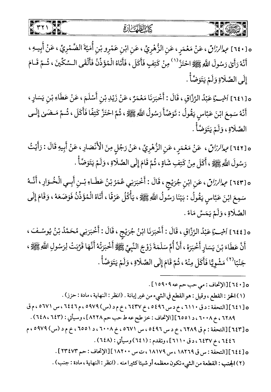 641- أخبرنا عبد الرزاق، قَالَ: أَخْبَرَنَا مَعْمَرٌ، عَن زَيْدِ بْنِ أَسْلَمَ، عَنْ عَطَاءِ بْنِ يَسَارٍ، أَنَّهُ سَمِعَ ابْنَ عَبَّاسٍ يَقُولُ: تَوَضَّأَ رَسُولُ اللهِ صَلَّى اللهُ عَلَيْهِ وَسَلَّمَ، ثُمَّ احْتَزَّ كَتِفًا فَأَكَلَ، ثُمَّ مَضَى إِلَى الصَّلاَةِ، وَلَمْ يَتَوَضَّأْ.