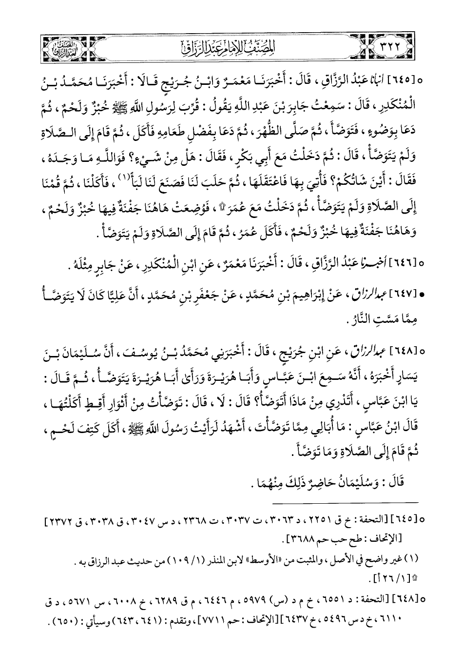 648- عبد الرزاق، عَنِ ابْنِ جُرَيْجٍ، قَالَ: أَخْبَرَنِي مُحَمَّدُ بن يُوسُفَ، أَنَّ سُلَيْمَانَ بن يَسَارٍ أَخْبَرَهُ، أَنَّهُ سَمِعَ ابْنَ عَبَّاسٍ، وَأَبَا هُرَيْرَةَ، وَرَأَى أَبَا هُرَيرَةَ يَتَوَضَّأُ، ثُمَّ قَالَ: يَا ابْنَ عَبَّاسٍ، أَتَدْرِي مِنْ مَاذَا أَتَوَضَّأُ؟ قَالَ: لاَ، قَالَ: تَوَضَّأْتُ مِنْ أَثْوَارِ أَقِطٍ أَكَلْتُهَا، قَالَ ابْنُ عَبَّاسٍ: مَا أُبَالِي مِمَّا تَوَضَّأْتَ، أَشْهَدُ لَرَأَيْتُ رَسُولَ اللهِ صَلَّى اللهُ عَلَيْهِ وَسَلَّمَ أَكَلَ كَتِفَ لَحْمٍ، ثُمَّ قَامَ إِلَى الصَّلاَةِ، وَمَا تَوَضَّأَ.