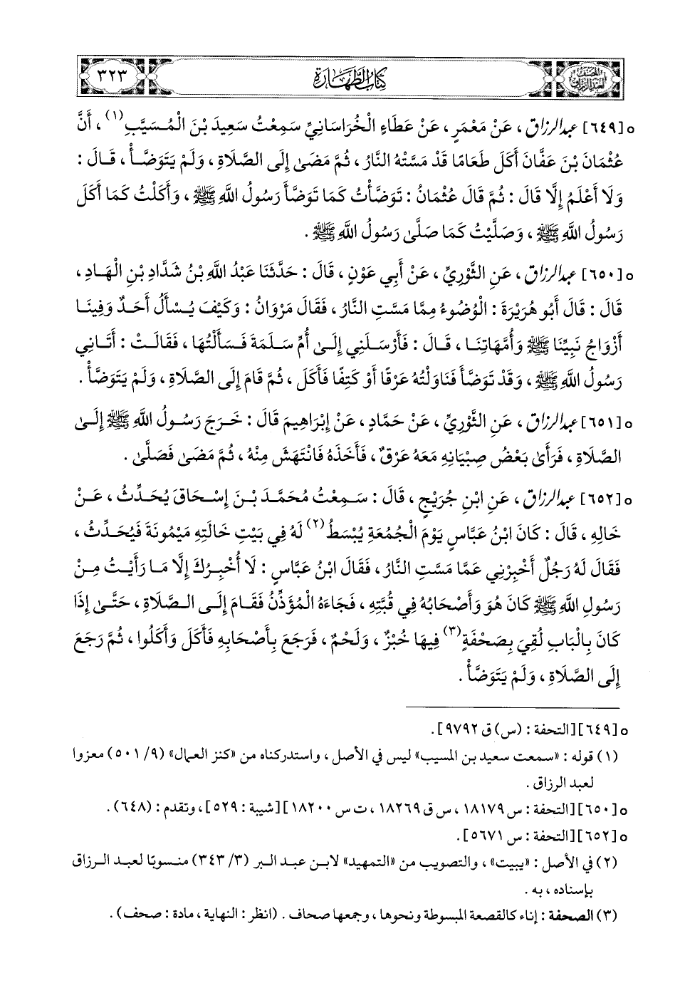 649- عبد الرزاق، عَنْ مَعْمَرٍ، عَنْ عَطَاءٍ الْخُرَاسَانِيِّ، سَمِعْتُ سَعيدَ بن المُسَيَّبِ، أَنَّ عُثْمَانَ بن عَفَّانَ أَكَلَ طَعَامًا قَدْ مَسَّتْهُ النَّارُ، ثُمَّ مَضَى إِلَى الصَّلاَةِ وَلَمْ يَتَوَضَّأْ، قَالَ: وَلاَ أَعْلَمُ إِلاَّ قَالَ: ثُمَّ قَالَ عُثْمَانُ: تَوَضَّأْتُ كَمَا تَوَضَّأَ رَسُولُ اللهِ صَلَّى اللهُ عَلَيْهِ وَسَلَّمَ، وَأَكَلْتُ كَمَا أَكَلَ رَسُولُ اللهِ صَلَّى اللهُ عَلَيْهِ وَسَلَّمَ، وَصَلَّيْتُ كَمَا صَلَّى رَسُولُ اللهِ صَلَّى اللهُ عَلَيْهِ وَسَلَّمَ.