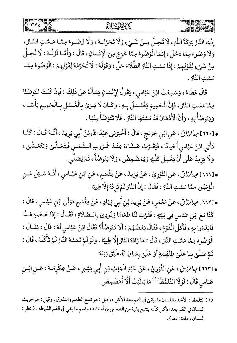 661- عبد الرزاق، عَنِ الثَّورِيِّ، عَن يَزِيدَ، عَن مِقْسَمٍ، عَنِ ابْنِ عَبَّاسٍ، أَنَّهُ سُئِلَ عَنِ الْوُضُوءِ مِمَّا مَسَّتِ النَّارُ، فَقَالَ: إِنَّ النَّارَ لَمْ تزِدْهُ إِلاَّ طَيِّبًا.