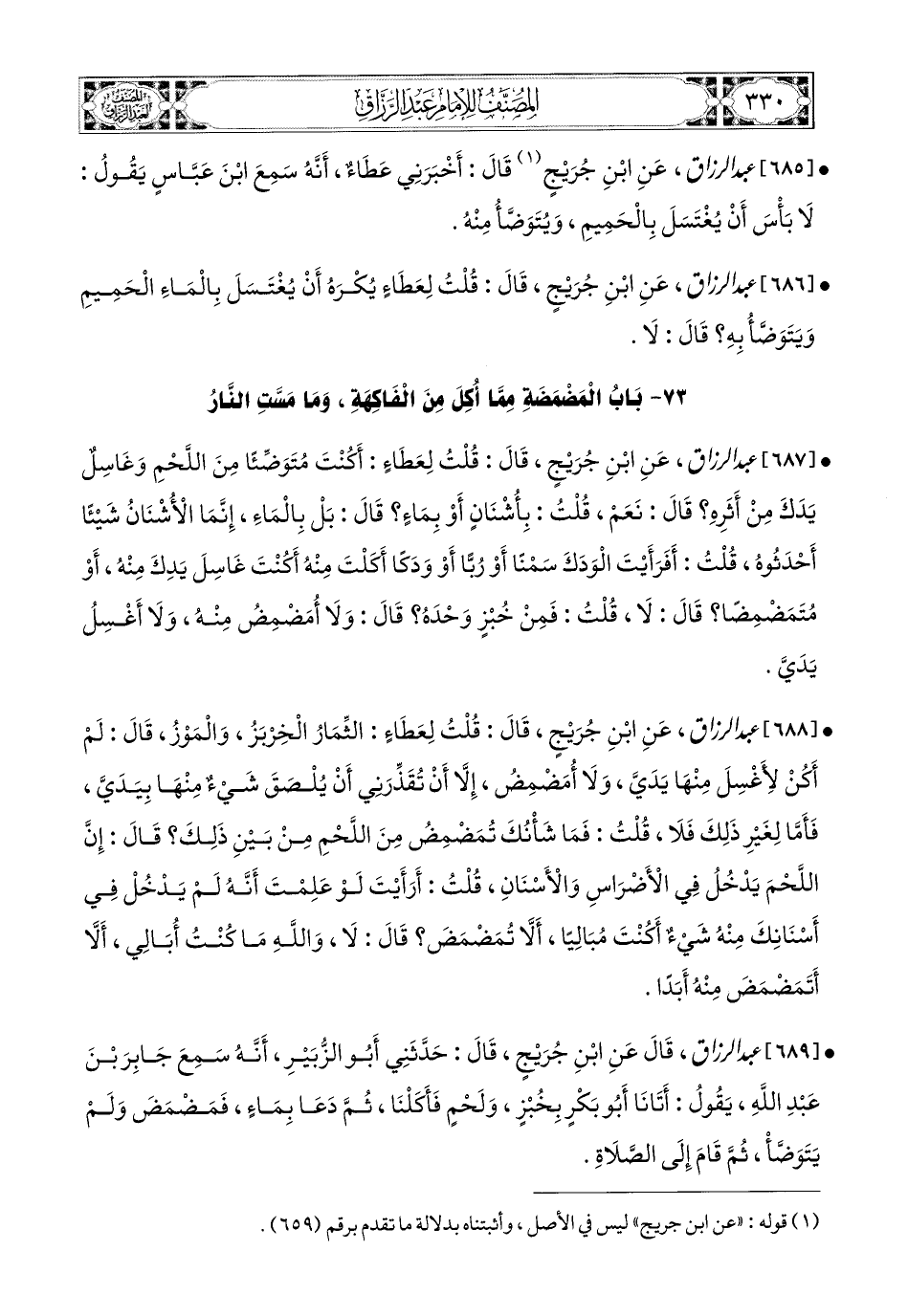 687- عبد الرزاق، عَنِ ابْنِ جُرَيْجٍ، قَالَ: قُلْتُ لِعَطَاءٍ: أَكُنْتَ مُتَوَضِّئًا مِنَ اللَّحْمِ وَغَاسِلٌ يَدِكَ مِنْ أَثَرِهِ؟ قَالَ: نَعَمْ، قُلْتُ: بِأُشْنَانٍ، أَوْ بِمَاءٍ؟ قَالَ: بَلْ بِالمَاءِ، إِنَّمَا الأُشْنَانُ شَيْئًا أَحْدَثُوهُ، قُلْتُ: أَفَرَأَيْتَ الْوَدَكَ سَمْنًا، أَوْ رُبًّا، أَوْ وَدَكًا أَكَلْتَ مِنْهُ أَكُنْتَ غَاسِلَ يَدِكَ مِنْهُ، أَوْ مُتَمَضْمِضًا؟ قَالَ: لاَ، قُلْتُ: فَمِنْ خُبْزٍ وَحْدَهُ؟ قَالَ: وَلاَ أُمَضْمِضُ مِنْهُ وَلاَ أَغْسِلُ يَدَيَّ.