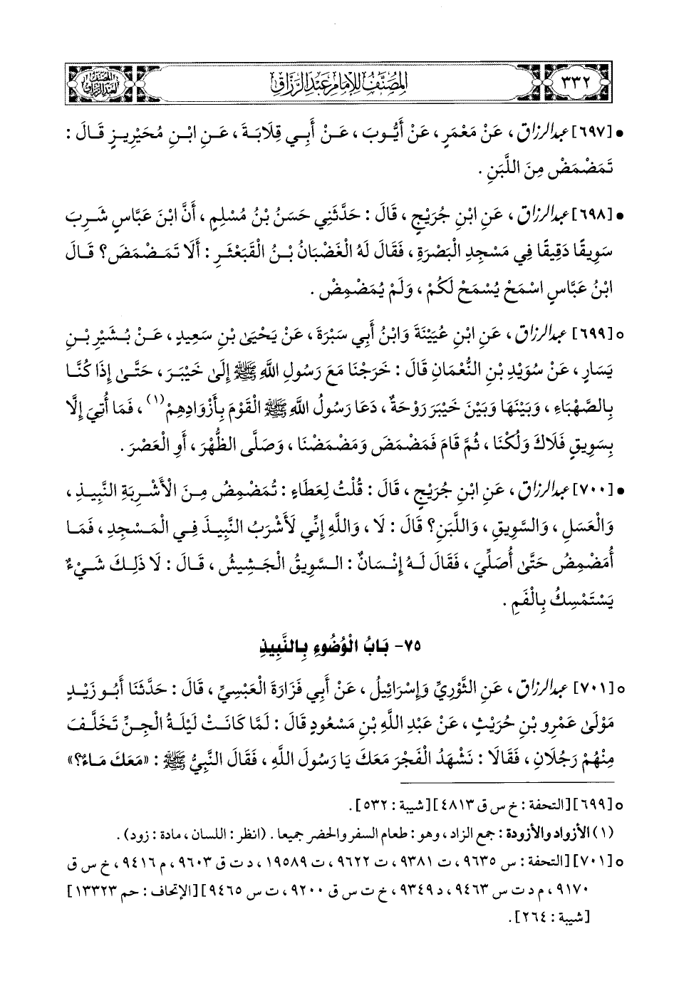 701- عبد الرزاق، عَنِ الثَّورِيِّ، وَإِسْرَائِيلَ، عَنْ أَبِي فَزَارَةَ الْعَبْسِيِّ، قَالَ: حَدَّثنا أَبو زَيْدٍ، مَوْلَى عَمْرِو بنِ حُرَيْثٍ، عَنْ عَبدِ اللهِ بْنِ مَسْعُودٍ قَالَ: لَمَّا كَانَتْ لَيْلَةُ الْجِنِّ، تَخَلَّفَ مِنْهُمْ رَجُلاَنِ، فَقَالاَ: نَشْهَدُ الْفَجْرَ مَعَكَ يَا رَسُولَ اللهِ، فَقَالَ النَّبِيُّ صَلَّى اللهُ عَلَيْهِ وَسَلَّمَ: مَعَكَ مَاءٌ؟ قُلْتُ: لَيْسَ مَعِي مَاءٌ، وَلَكِنْ مَعِي إِدَاوَةٌ فِيهَا نَبِيذٌ، فَقَالَ النَّبِيُّ صَلَّى اللهُ عَلَيْهِ وَسَلَّمَ: تَمْرَةٌ طَيِّبَةٌ، وَمَاءٌ طَهُورٌ فَتَوَضَّأْ.