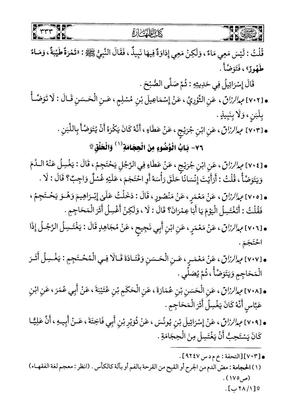 707- عبد الرزاق، عَنْ مَعْمَرٍ، عَنِ الْحَسَنِ، وَقَتَادَةَ، قَالاَ فِي المُحْتَجِمِ: يَغْسِلُ أَثَرَ المَحَاجِمِ ويَتَوَضَّأُ، ثُمَّ يُصَلِّي.
