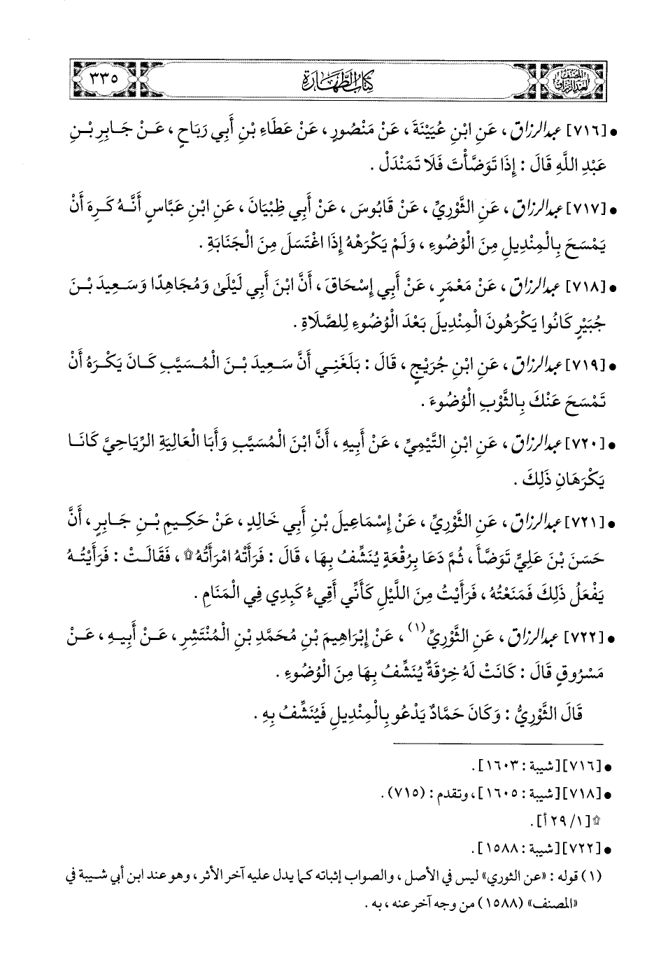 718- عبد الرزاق، عَنْ مَعْمَرٍ، عَنْ أَبِي إِسْحَاقَ، أَنَّ ابْنَ أَبِي لَيْلَى، وَمُجاهِدًا، وَسَعيدَ بن جُبَيرٍ كَانُوا يَكْرَهُونَ المِنْدِيلَ بَعْدَ الْوُضُوءِ لِلصَّلاَةِ.