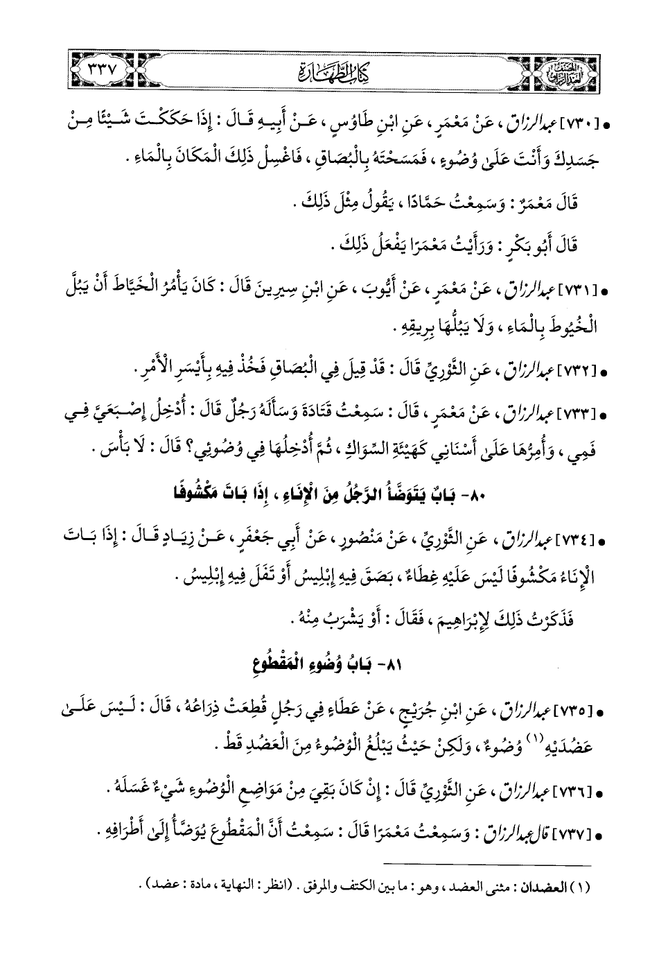 737- قَالَ عبد الرزاق: وَسَمِعْتُ مَعْمَرًا قَالَ: سَمِعْتُ أَنَّ المَقْطُوعَ يُوَضَّأُ إِلَى أَطْرَافِهِ.