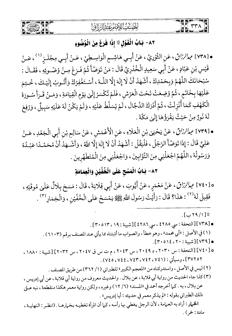 738- عبد الرزاق، عَنِ الثَّورِيِّ، عَنْ أَبِي هَاشِمٍ الْوَاسِطِيِّ، عَنْ أَبِي مِجْلَزٍ، عَن قَيْسِ بْنِ عُبَادٍ، عَنْ أَبِي سَعيدٍ الْخُدْرِيِّ قَالَ: مَنْ تَوَضَّأَ، ثُمَّ فَرَغَ مِنْ وُضُوئِهِ فَقَالَ: سُبْحَانَكَ اللهُمَّ وَبِحَمْدِكَ، أَشْهَدُ أَنْ لاَ إِلَهَ إِلاَّ اللهُ، أَسْتَغْفِرُكَ وَأَتُوبُ إِلَيْكَ، خُتِمَ عَلَيْهَا بِخَاتَمٍ ثُمَّ وُضِعَتْ تَحْتَ الْعَرْشِ، فَلَمْ تُكْسَرْ إِلَى يَوْمِ الْقِيَامَةِ، وَمَنْ قَرَأَ سُورَةَ الْكَهْفِ كَمَا أُنْزِلَتْ، ثُمَّ أَدْرَكَ الدَّجَّالَ لَمْ يُسَلَّطْ عَلَيْهِ وَلَمْ يَكُنْ لَهُ عَلَيْهِ سَبِيلٌ وَرُفِعَ لَهُ نُورٌ مِنْ حَيْثُ يَقْرَأُهَا إِلَى مَكَّةَ.