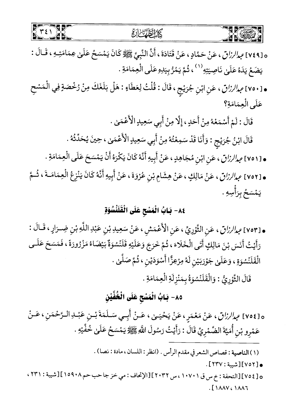 749- عبد الرزاق، عَن حَمَّادٍ، عَن قَتَادَةَ، أَنَّ النَّبِيَّ صَلَّى اللهُ عَلَيْهِ وَسَلَّمَ كَانَ يَمْسَحُ عَلَى عِمَامَتِهِ قَالَ: يَضَعُ يَدَهُ عَلَى نَاصِيَتِهِ، ثُمَّ يُمِرُّ بِيَدِهِ عَلَى الْعِمَامَةِ.