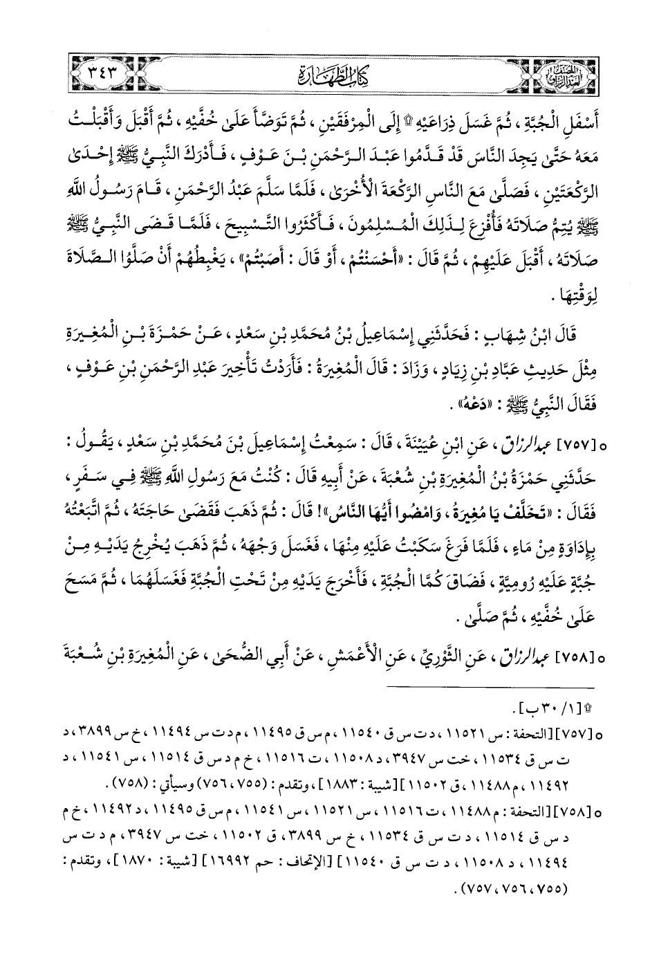 757- عبد الرزاق، عَنِ ابْنِ عُيَيْنَةَ، قَالَ: سَمِعْتُ إِسْمَاعِيلَ بن مُحَمَّدِ بْنِ سَعْدٍ يَقُولُ: حَدَّثَنِي حَمْزَةُ بن المُغِيرَةِ بْنِ شُعْبَةَ، عَنْ أَبِيهِ، قَالَ: كُنْتُ مَعَ رَسُولِ اللهِ صَلَّى اللهُ عَلَيْهِ وَسَلَّمَ فِي سَفَرٍ، فَقَالَ: تَخَلَّفْ يَا مُغِيرَةُ، وَامْضُوا أَيُّهَا النَّاسُ، قَالَ: ثُمَّ ذَهَبَ فَقَضَى حَاجَتَهُ، ثُمَّ اتَّبَعْتُهُ بِإِدَاوَةٍ مِنْ مَاءٍ، فَلَمَّا فَرَغَ سَكَبْتُ عَلَيْهِ مِنْهَا، فَغَسَلَ وَجْهَهُ، ثُمَّ ذَهَبَ يُخْرِجُ يَدَيْهِ مِنْ جُبَّةٍ عَلَيْهِ رُومِيَّةٍ، فَضَاقَ كُمَّا الْجُبَّةِ، فَأَخْرَجَ يَدَيْهِ مِنْ تَحْتِ الْجُبَّةِ فَغَسَلَهُمَا، ثُمَّ مَسَحَ عَلَى خُفَّيْهِ، ثُمَّ صَلَّى.
