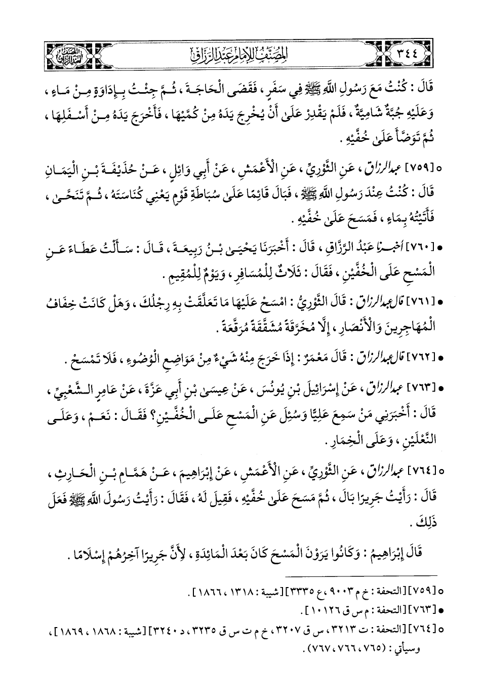 761- قَالَ عبد الرزاق: قَالَ الثَّورِيُّ: امْسَحْ عَلَيْهَا مَا تَعَلَّقَتْ بِهِ رِجْلُكَ، وَهَلْ كَانَتْ خِفَافُ المُهَاجِرِينَ وَالأَنْصَارِ إِلاَّ مُخَرَّقَةً مُشَقَّقَةً مُرَقَّعَةً.