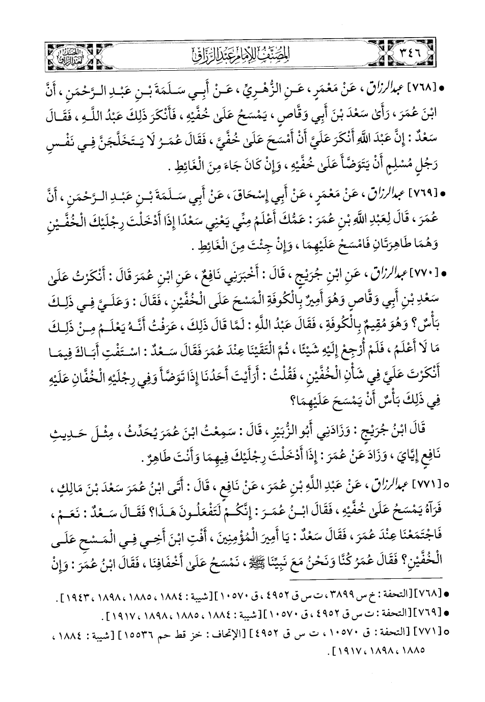 771 - عبد الرزاق، عَنْ عَبدِ اللهِ بْنِ عُمَرَ (1)، عَن نَافِعٍ، قَالَ: أَتَى ابْنُ عُمَرَ سَعْدَ بن مَالِكٍ، فَرَآهُ يَمْسَحُ عَلَى خُفَّيْهِ، فَقَالَ ابْنُ عُمَرَ: إِنَّكُمْ لَتَفْعَلُونَ هَذَا؟ فَقَالَ سَعْدٌ: نَعَمْ، فَاجْتَمَعْنَا عِنْدَ عُمَرَ، فَقَالَ سَعْدٌ: يَا أَمِيرَ المُؤْمِنِينَ، أَفْتِ ابْنَ أَخِي فِي المَسْحِ عَلَى الْخُفَّيْنِ؟ فَقَالَ عُمَرُ: كُنَّا وَنَحْنُ مَعَ نَبِيِّنَا صَلَّى اللهُ عَلَيْهِ وَسَلَّمَ نَمْسَحُ عَلَى أَخْفَافِنَا (2)، فَقَالَ ابْنُ عُمَرَ: وَإِنْ جَاءَ مِنَ الْغَائِطِ وَالْبَوْلِ؟ فَقَالَ عُمَرُ: نَعَمْ، وَإِنْ جَاءَ مِنَ الْغَائِطِ وَالْبَوْلِ.