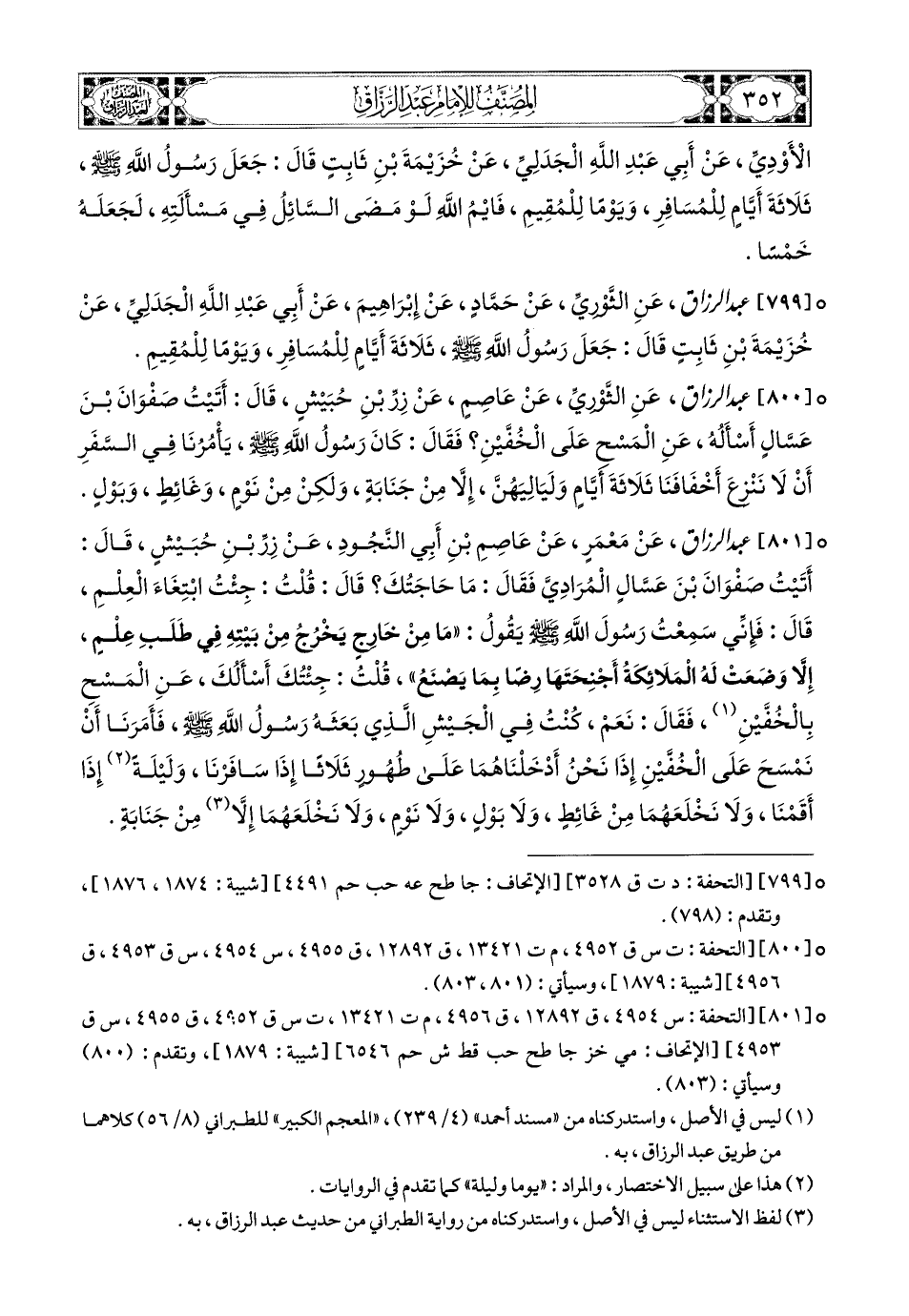 801- عبد الرزاق، عَنْ مَعْمَرٍ، عَنْ عَاصِمِ بْنِ أَبِي النَّجُودِ، عَن زِرِّ بْنِ حُبَيْشٍ، قَالَ: أَتَيْتُ صَفْوَانَ بن عَسَّالٍ المُرَادِيَّ، فَقَالَ: مَا حَاجَتُكَ؟ قَالَ: قُلْتُ: جِئْتُ أَبْتَغِاء الْعِلْمَ، قَالَ: فَإِنِّي سَمِعْتُ رَسُولَ اللهِ صَلَّى اللهُ عَلَيْهِ وَسَلَّمَ يَقُولُ: مَا مِنْ خَارِجٍ يَخْرُجُ مِنْ بَيْتِهِ فِي طَلَبِ عِلْمٍ، إِلاَّ وَضَعَتْ لَهُ المَلاَئِكَةُ أَجْنِحَتَهَا رِضًى بِمَا يَصْنَعُ، قُلْتُ: جِئْتُكَ أَسْأَلُكَ عَنِ المَسْحِ بالْخُفَّيْنِ، فَقَالَ: نَعَمْ، كُنْتُ فِي الْجَيْشِ الَّذِي بَعَثَهُ رَسُولُ اللهِ صَلَّى اللهُ عَلَيْهِ وَسَلَّمَ، فَأَمَرَنَا أَنْ نَمْسَحَ عَلَى الْخُفَّيْنِ إِذَا نَحْنُ أَدْخَلْنَاهُمَا عَلَى طُهُورٍ ثَلاَثًا، إِذَا سَافَرْنَا وَلَيْلَةً إِذَا أَقَمْنَا، وَلاَ نَخْلَعُهُمَا مِنْ غَائِطٍ وَلاَ بَوْلٍ وَلاَ نَوْمٍ، وَلاَ نَخْلَعُهُمَا إِلاَّ مِنْ جَنَابَةٍ.