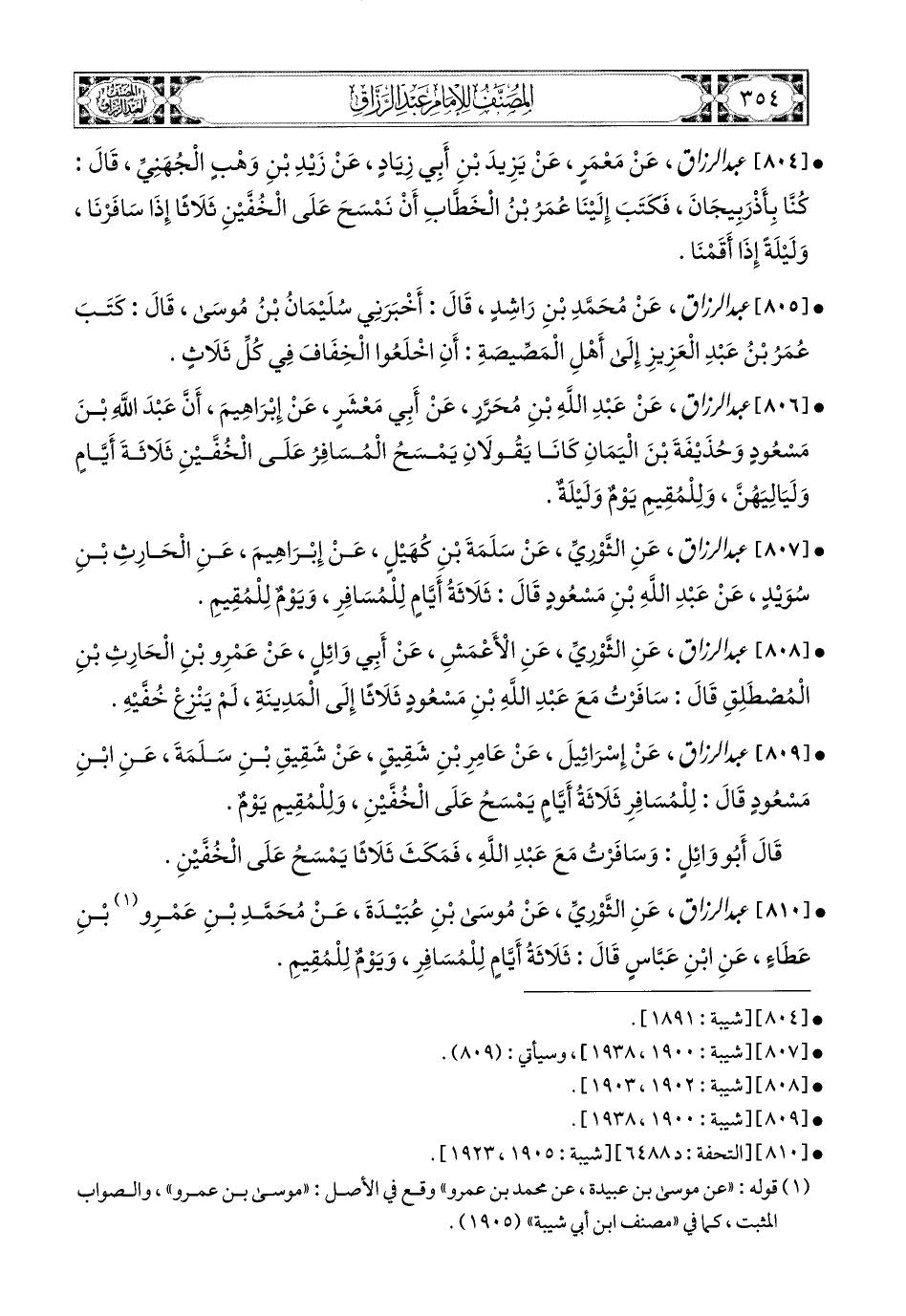 808- عبد الرزاق، عَنِ الثَّورِيِّ، عَنِ الأَعمَشِ، عَنْ أَبِي وَائِلٍ، عَنْ عَمْرِو بنِ الْحَارِثِ بْنِ المُصْطَلِقِ قَالَ: سَافَرْتُ مَعَ عَبدِ اللهِ بْنِ مَسْعُودٍ ثَلاَثًا إِلَى المَدِينَةِ، لَمْ يَنْزِعْ خُفَّيْهِ.