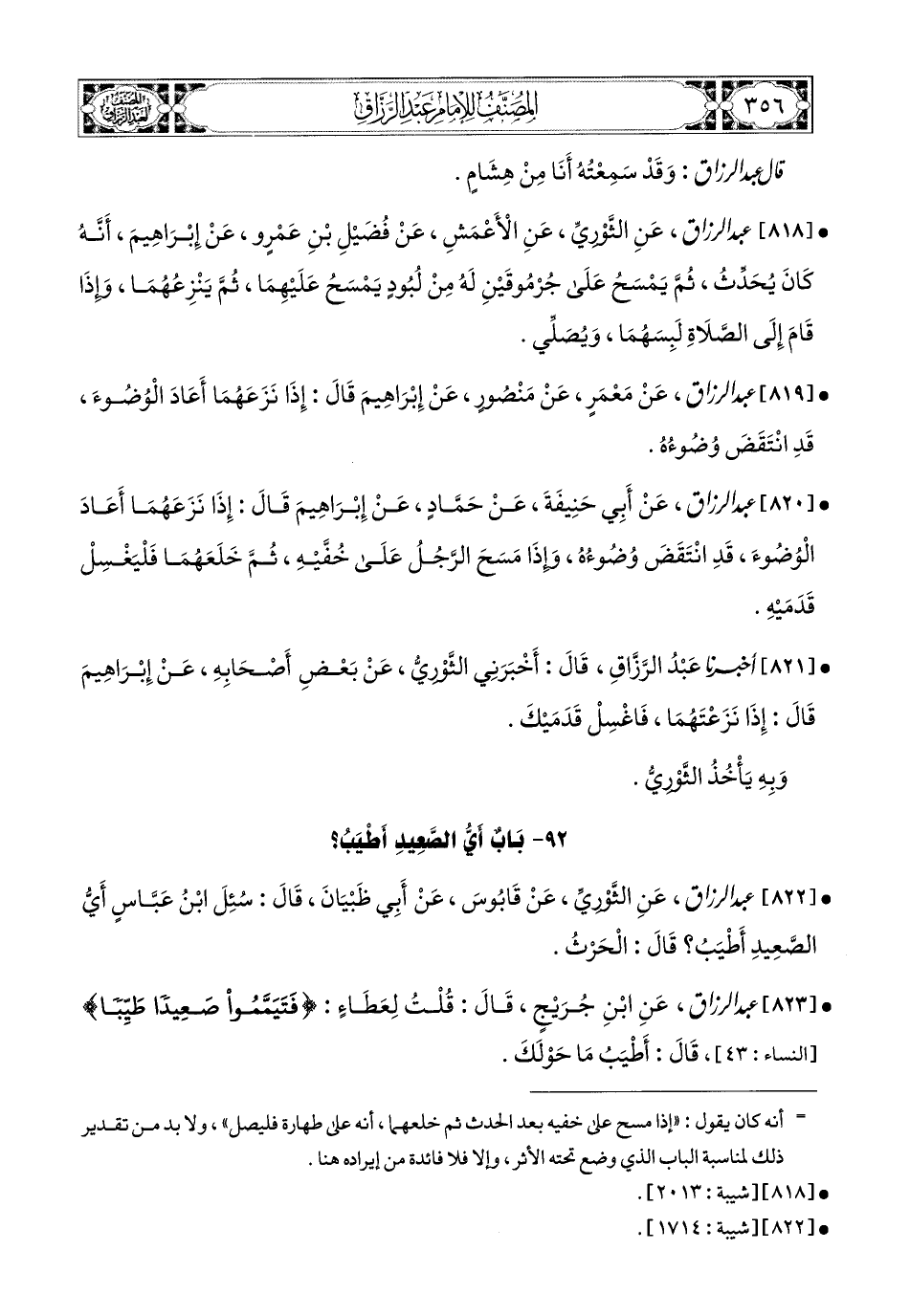 821- أخبرنا عبد الرزاق، قَالَ: أَخْبَرَنِي الثَّورِيُّ، عَن بَعْضِ أَصْحَابِهِ، عَن إِبرَاهِيمَ، قَالَ: إِذَا نَزَعْتَهُمَا فَاغْسِلْ قَدَمَيْكَ.