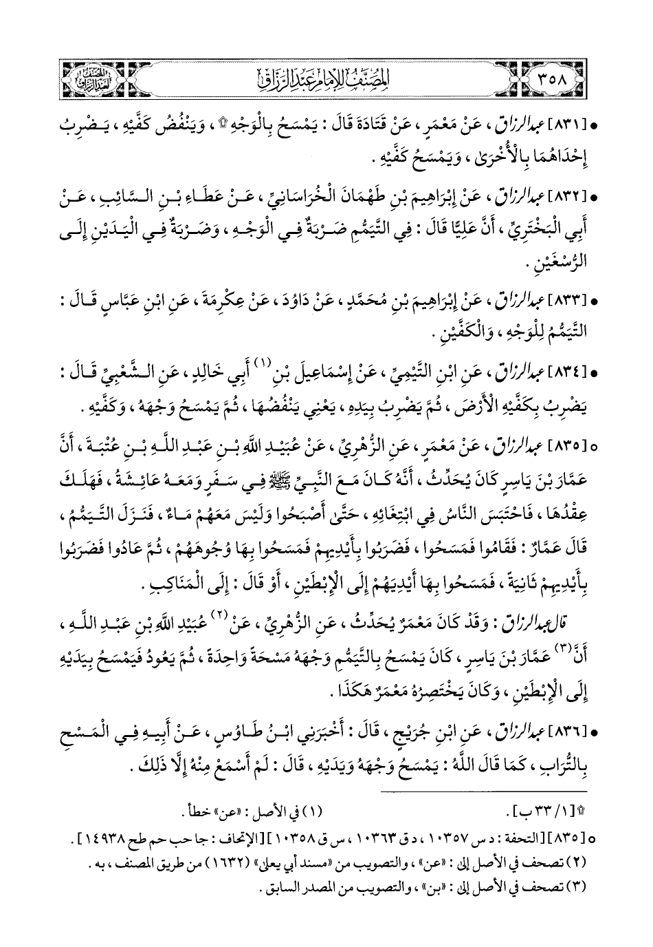 قَالَ عَبدُ الرَّزَّاقِ: وَقَدْ كَانَ مَعْمَرٌ يُحَدِّثُ عَنِ الزُّهْرِيِّ، عَن عُبَيْدِ اللهِ بْنِ عَبدِ اللهِ، أَنَّ عَمَّارَ بن يَاسِرٍ كَانَ يَمْسَحُ بِالتَّيَمُّمِ وَجْهَهُ مَسْحَةً وَاحِدَةً، ثُمَّ يَعُودُ فَيَمْسَحُ بِيَدَيْهِ إِلَى الإِبْطَيْنِ، وَكَانَ يَخْتَصِرُهُ مَعْمَرٌ هَكَذَا.
