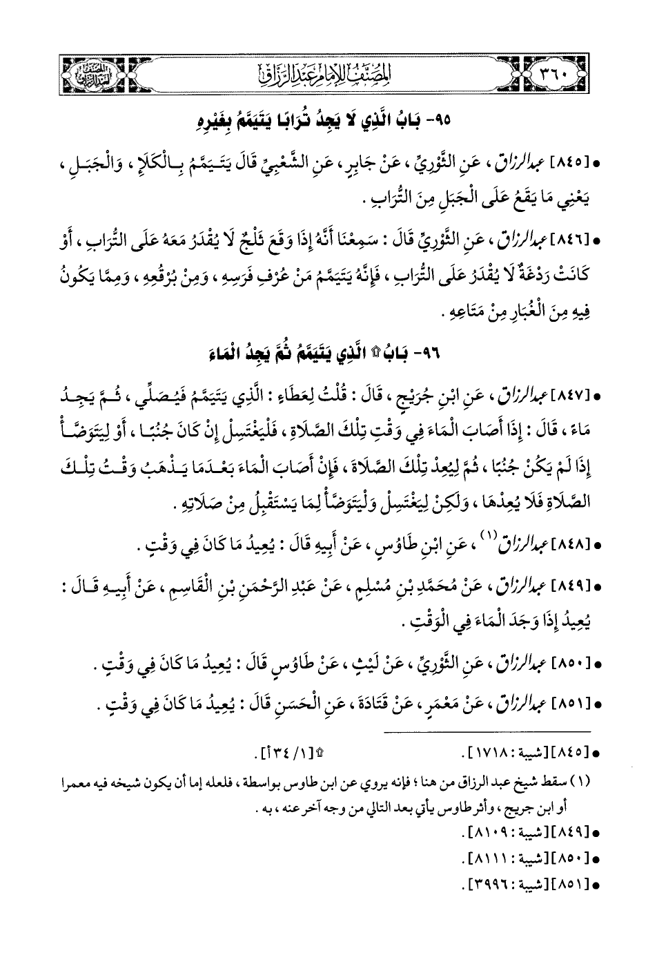849- عبد الرزاق، عَن مُحَمَّدِ بْنِ مُسْلِمٍ، عَنْ عَبدِ الرَّحْمَنِ بْنِ الْقَاسِمِ، عَنْ أَبِيهِ، قَالَ: يُعِيدُ إِذَا وَجَدَ المَاءَ فِي الْوَقْتِ.