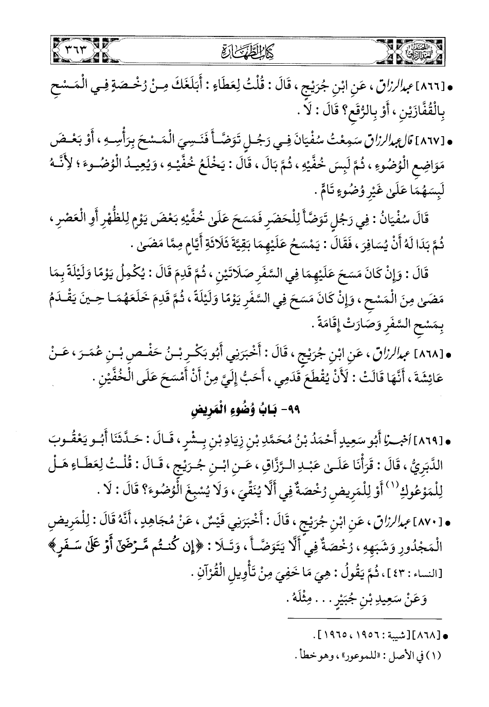 869- أَخْبَرَنَا أَبو سَعيدٍ أَحْمَدُ بن مُحَمَّدِ بْنِ زِيَادِ بْنِ بِشْرٍ، قَالَ: حَدَّثنا أَبو يَعْقُوبَ الدَّبَرِيُّ، قَالَ: قرأنا على عَبد الرزَّاق، عَنِ ابْنِ جُرَيْجٍ، قَالَ: قُلْتُ لِعَطَاءٍ: هَلْ لِلْمَوْعُوكِ، أَوْ لِلْمَرِيضِ رُخْصَةٌ فِي أَلاَّ يُنَقِّيَ، وَلاَ يُسْبِغَ الْوُضُوءَ؟ قَالَ: لاَ.