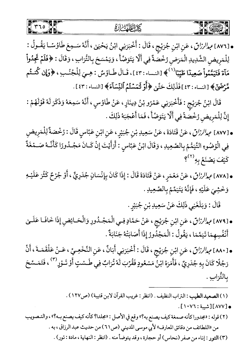 878- عبد الرزاق، عَنْ مَعْمَرٍ، عَن قَتَادَةَ، قَالَ: إِذَا كَانَ بِإِنْسَانٍ جُدَرِيٌّ، أَوْ جُرْحٌ كثر عَلَيْهِ، وَخَشِيَ عَلَيْهِ، فَإِنَّهُ يَتَيَمَّمُ بِالصَّعِيدِ، قَالَ: وَبَلَغَنِي ذَلِكَ عَن سَعيدِ بْنِ جُبَيرٍ.