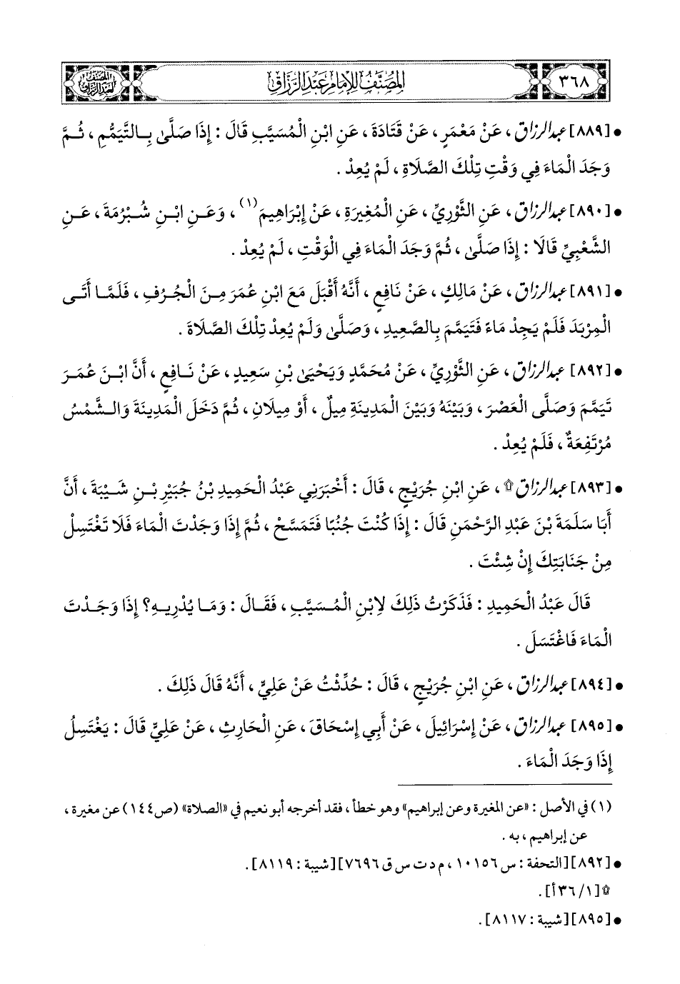 890- عبد الرزاق، عَنِ الثَّورِيِّ، عَنِ المُغِيرَةِ، عَن إِبرَاهِيمَ، وَعَنِ ابْنِ شُبْرُمَةَ، عَنِ الشَّعْبِيِّ، قَالاَ: إِذَا صَلَّى، ثُمَّ وَجَدَ المَاءَ فِي الْوَقْتِ لَمْ يُعِدْ.