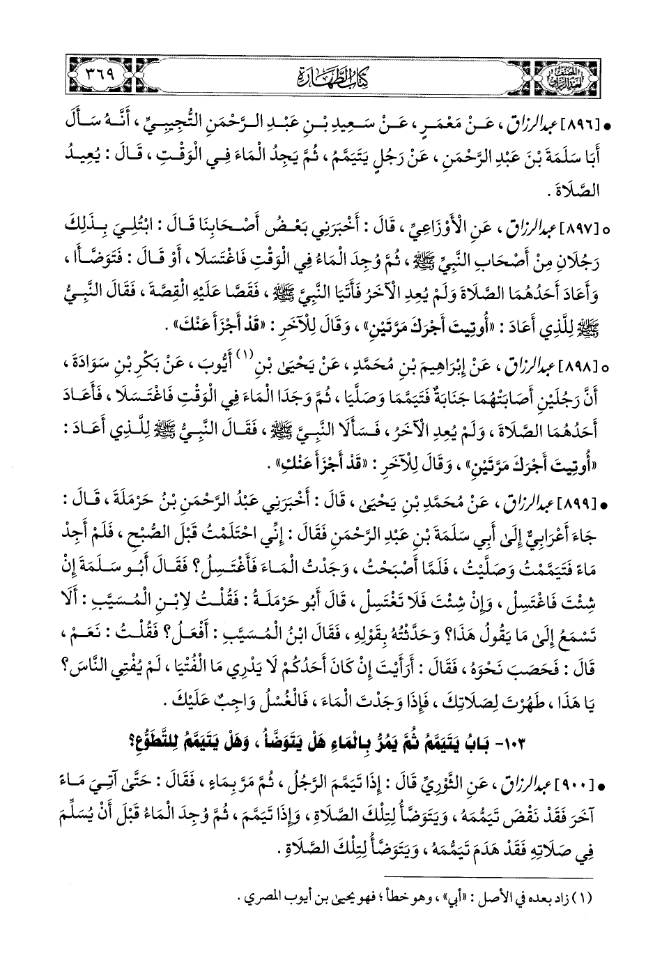 897- عبد الرزاق، عَنِ الأَوْزَاعِيِّ، قَالَ: أَخْبَرَنِي بَعْضُ أَصْحَابِنَا، قَالَ: ابْتُلِيَ بِذَلِكَ رَجُلاَنِ مِنْ أَصْحَابِ النَّبِيِّ صَلَّى اللهُ عَلَيْهِ وَسَلَّمَ، ثُمَّ وُجِدَ المَاءُ فِي الْوَقْتِ، فَاغْتَسَلاَ، أَوْ قَالَ: فَتَوَضَّآ، وَأَعَادَ أَحَدُهُمَا الصَّلاَةَ، وَلَمْ يُعِدِ الآخَرُ، فَأَتَيَا النَّبِيَّ صَلَّى اللهُ عَلَيْهِ وَسَلَّمَ، فَقَصَّا عَلَيْهِ الْقِصَّةَ، فَقَالَ النَّبِيُّ صَلَّى اللهُ عَلَيْهِ وَسَلَّمَ لِلَّذِي أَعَادَ: أُوتِيتَ أَجْرَكَ مَرَّتَيْنِ، وَقَالَ لِلآخَرِ: قَدْ أَجْزَأَ عَنْكَ.