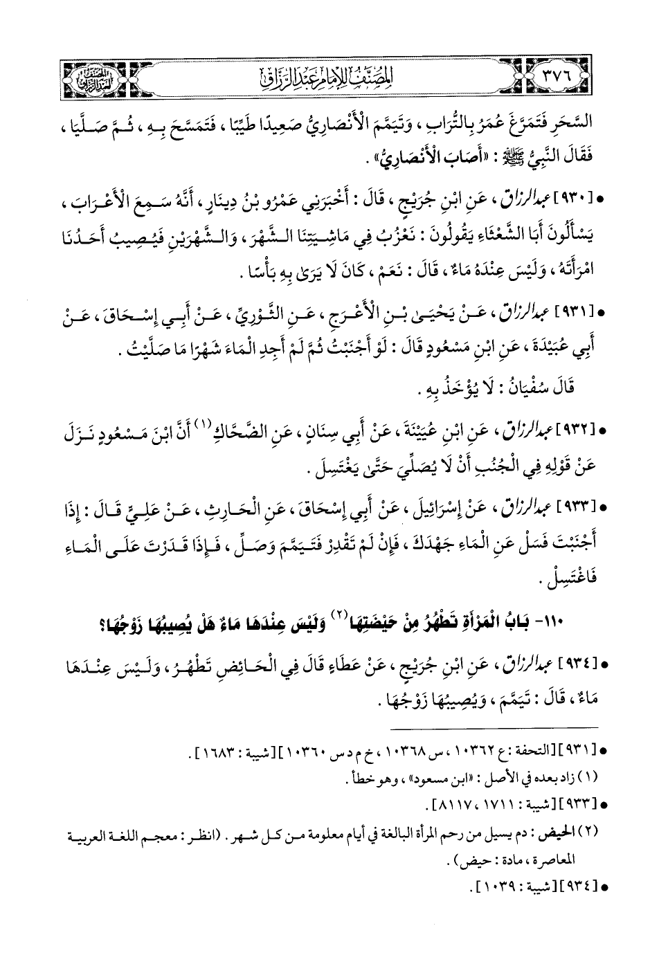 930- عبد الرزاق، عَنِ ابْنِ جُرَيْجٍ، قَالَ: أَخْبَرَنِي عَمْرُو بن دِينَارٍ، أَنَّهُ سَمِعَ الأَعْرَابَ يَسْأَلُونَ أَبَا الشَّعْثَاءِ، يَقُولُونَ: نَعْزُبُ فِي مَاشِيَتِنَا الشَّهْرَ وَالشَّهْرَيْنِ، فَيُصِيبُ أَحَدُنَا امْرَأَتَهُ، وَلَيْسَ عِنْدَهُ مَاءٌ؟ قَالَ: نَعَمْ، كَانَ لاَ يَرَى بِهِ بَأْسًا.