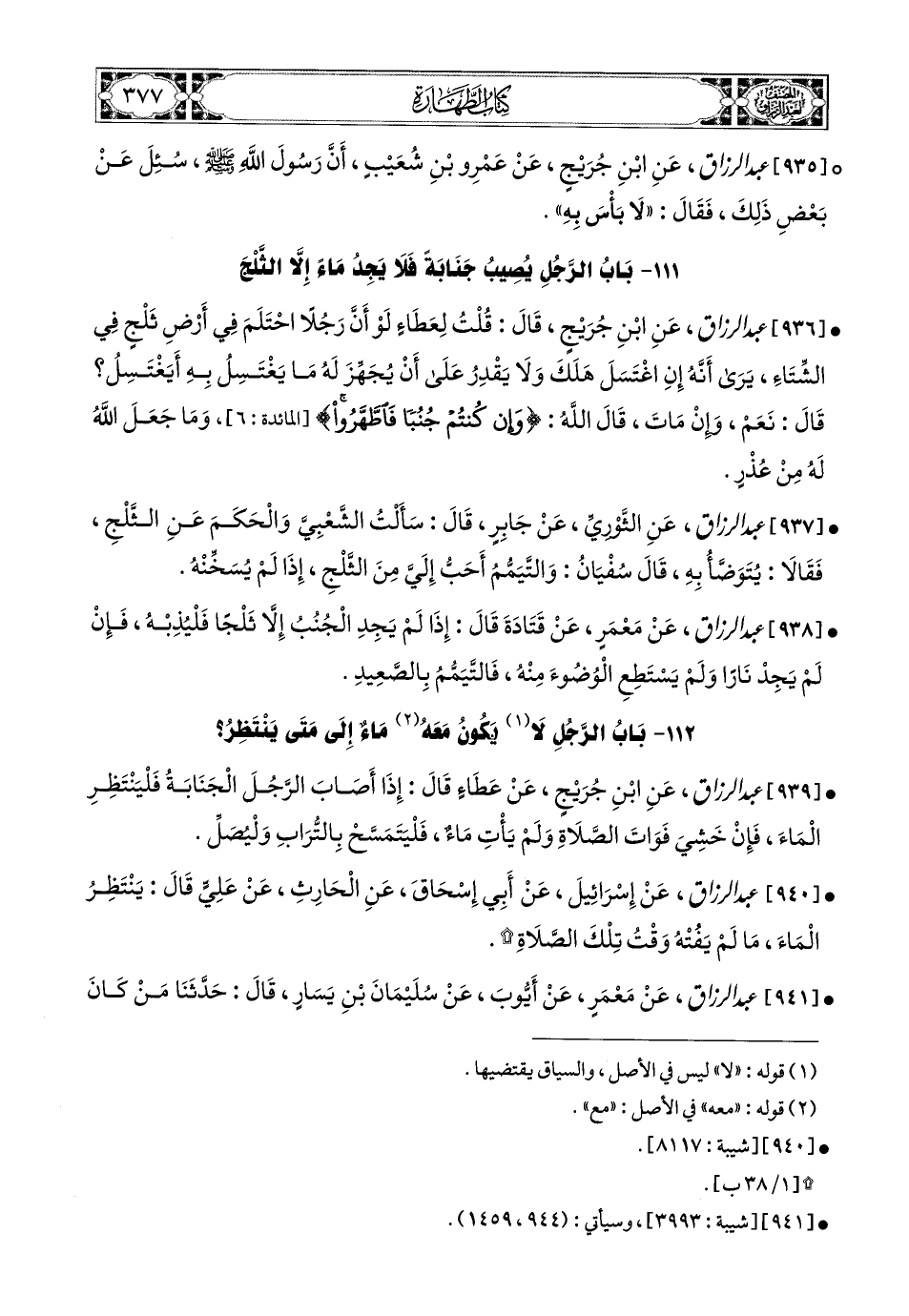 941- عبد الرزاق، عَنْ مَعْمَرٍ، عَنْ أَيُّوبَ، عَن سُلَيْمَانَ بْنِ يَسَارٍ، قَالَ: حَدَّثنا مَنْ كَانَ مَعَ عُمَرَ بْنِ الْخَطَّابِ فِي سَفَرٍ فَأَصَابَتْهُ جَنَابَةٌ وَلَيْسَ مَعَهُ مَاءٌ، فَقَالَ: أَتَرَوْنَا لَوْ رَفَعْنَا أَنْ نُدْرِكَ المَاءَ قَبْلَ طُلُوعِ الشَّمْسِ؟ قَالُوا: نَعَمْ، قَالَ: فَرَفَعُوا دَوَابَّهُمْ، فَجَاؤُوا قَبْلَ طُلُوعِ الشَّمْسِ، فَاغْتَسَلَ عُمَرُ وَصَلَّى.