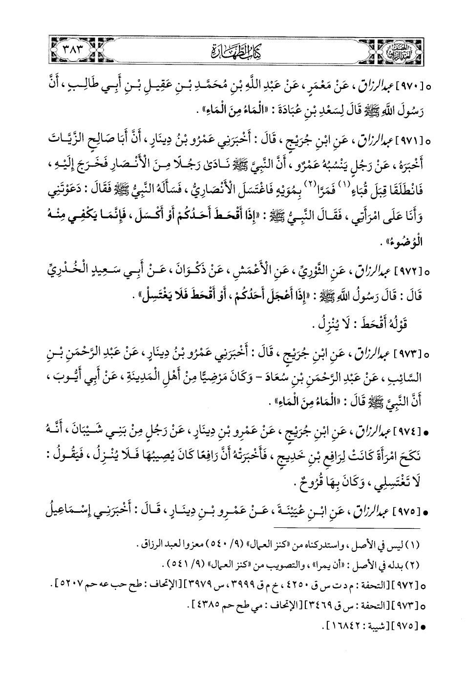 973- عبد الرزاق، عَنِ ابْنِ جُرَيْجٍ، قَالَ: أَخْبَرَنِي عَمْرُو بن دِينَارٍ، عَنْ عَبدِ الرَّحْمَنِ بْنِ السَّائِبِ، عَنْ عَبدِ الرَّحْمَنِ بْنِ سُعَادٍ، وَكَانَ مَرْضِيًّا مِنْ أَهْلِ المَدِينَةِ، عَنْ أَبِي أَيُّوبَ، أَنَّ النَّبِيَّ صَلَّى اللهُ عَلَيْهِ وَسَلَّمَ قَالَ: المَاءُ مِنَ المَاءِ.