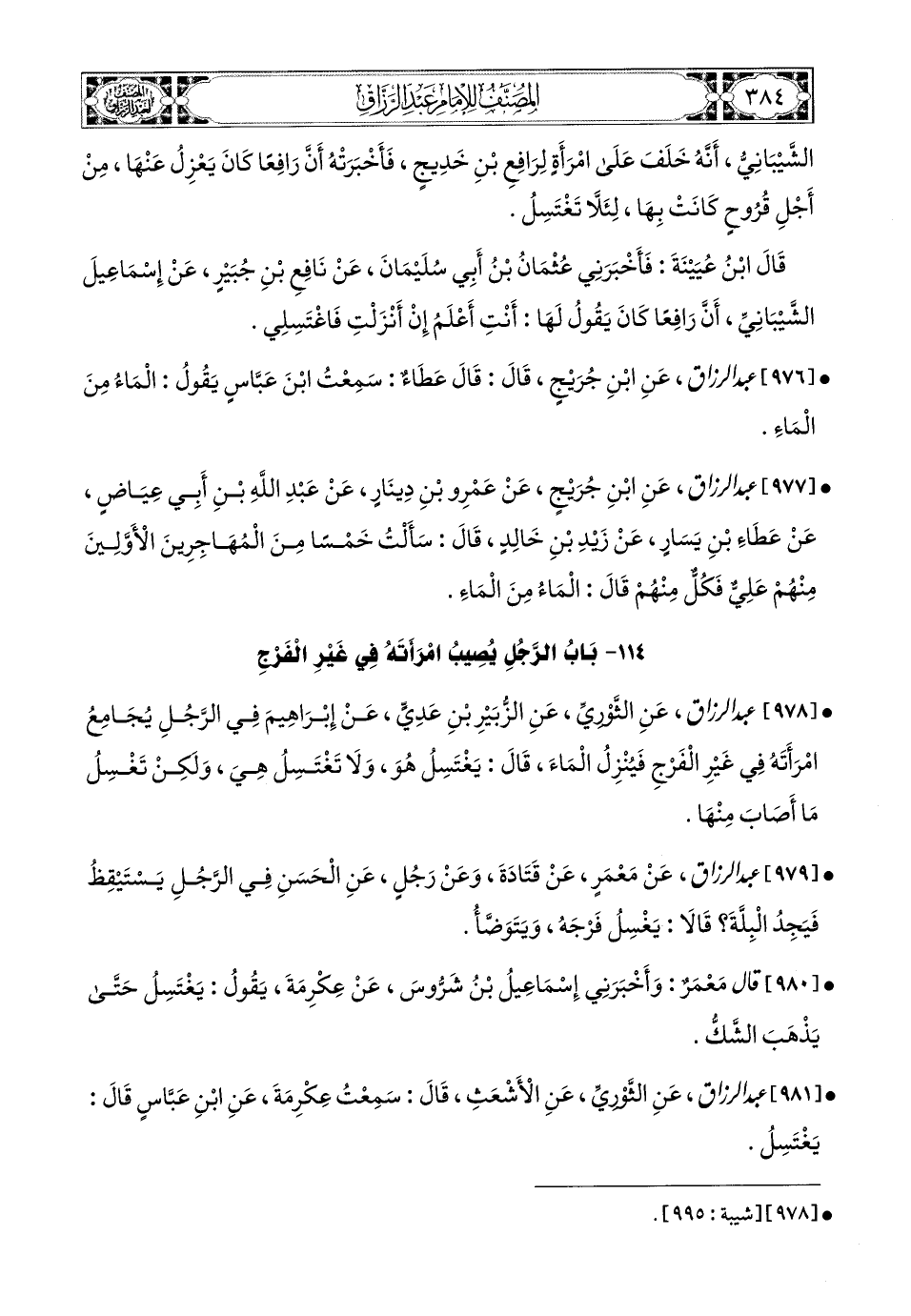 977- عبد الرزاق، عَنِ ابْنِ جُرَيْجٍ، عَنْ عَمْرِو بنِ دِينَارٍ، عَنْ عَبدِ اللهِ بْنِ أَبِي عِيَاضٍ، عَنْ عَطَاءِ بْنِ يَسَارٍ، عَن زَيْدِ بْنِ خَالِدٍ قَالَ: سَأَلْتُ خَمْسًا مِنَ المُهَاجِرِينَ الأَوَّلِينَ مِنْهُمْ عَلِيٌّ، فَكُلٌّ مِنْهُمْ قَالَ: المَاءُ مِنَ المَاءِ.