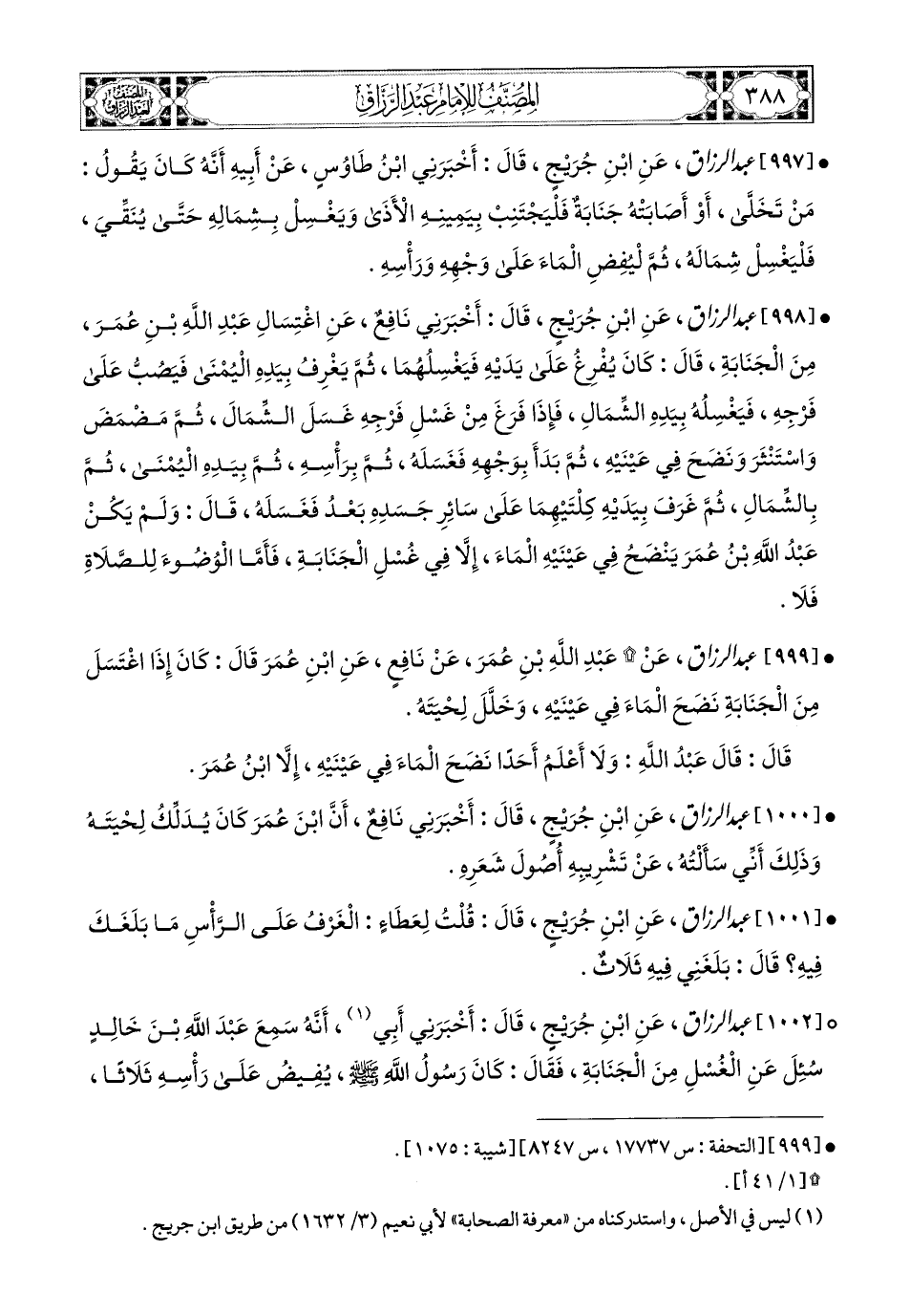 998- عبد الرزاق، عَنِ ابْنِ جُرَيْجٍ، قَالَ: أَخْبَرَنِي نَافِعٌ عَنِ اغْتِسَالِ عَبدِ اللهِ بْنِ عُمَرَ مِنَ الْجَنَابَةِ قَالَ: كَانَ يُفْرِغُ عَلَى يَدَيْهِ فَيَغْسِلُهُمَا، ثُمَّ يَغْرِفُ بِيَدِهِ الْيُمْنَى، فَيَصُبُّ عَلَى فَرْجِهُ فَيَغْسِلُهُ بِيَدِهِ الشَّمَالِ، فَإِذَا فَرَغَ مِنْ غَسْلِ فَرْجِهِ غَسَلَ الشَّمَالَ، ثُمَّ مَضْمَضَ وَاسْتَنْثَرَ وَنَضَحَ فِي عَيْنَيْهِ، ثُمَّ بَدَأَ بِوَجْهِهِ فَغَسَلَهُ، ثُمَّ بِرَأْسِهِ، ثُمَّ بِيَدِهِ الْيُمْنَى، ثُمَّ بِالشَّمَالِ، ثُمَّ غَرَفَ بِيَدَيْهِ كِلْتَيْهِمَا عَلَى سَائِرِ جَسَدِهِ بَعْدُ فَغَسَلَهُ، قَالَ: وَلَمْ يَكُنْ عَبدُ اللهِ بن عُمَرَ يَنْضَحُ فِي عَيْنَيْهِ المَاءَ، إِلاَّ فِي غُسْلِ الْجَنَابَةِ، فَأَمَّا الْوُضُوءُ لِلصَّلاَةِ فَلاَ.