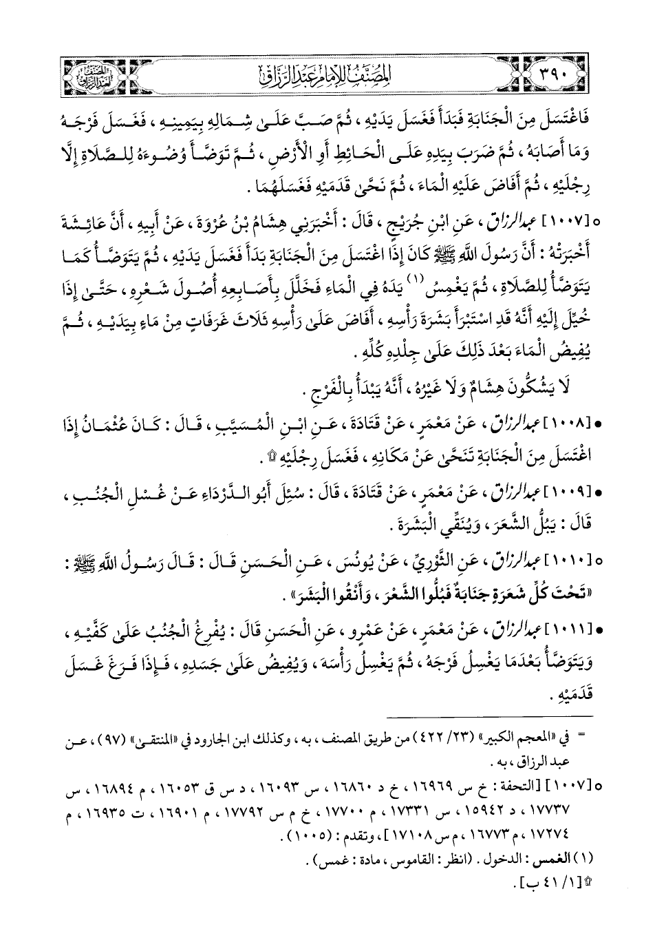 1007- عبد الرزاق، عَنِ ابْنِ جُرَيْجٍ، قَالَ: أَخْبَرَنِي هِشَامُ بن عُرْوَةَ، عَنْ أَبِيهِ، أَنَّ عَائِشَةَ أَخْبَرَتْهُ؛ أَنَّ رَسُولَ اللهِ صَلَّى اللهُ عَلَيْهِ وَسَلَّمَ كَانَ إِذَا اغْتَسَلَ مِنَ الْجَنَابَةِ بَدَأَ فَغَسَلَ يَدَيْهِ، ثُمَّ يَتَوَضَّأُ كما يتوضأ لِلصَّلاَةِ، ثُمَّ يَغْمِسُ يَدَهُ فِي المَاءِ، فَخَلَّلَ بِأَصَابِعِهِ أُصُولَ شَعَرِهِ، حَتَّى إِذَا خُيِّلَ إِلَيْهِ أَنَّهُ قَدِ اسْتَبْرَأَ بَشَرَةَ رَأْسِهِ أَفَاضَ عَلَى رَأْسِهِ ثَلاَثَ غَرَفَاتٍ مِنْ مَاءٍ بِيَدَيْهِ، ثُمَّ يُفِيضُ المَاءَ بَعْدَ ذَلِكَ عَلَى جِلْدِهِ كُلِّهِ.