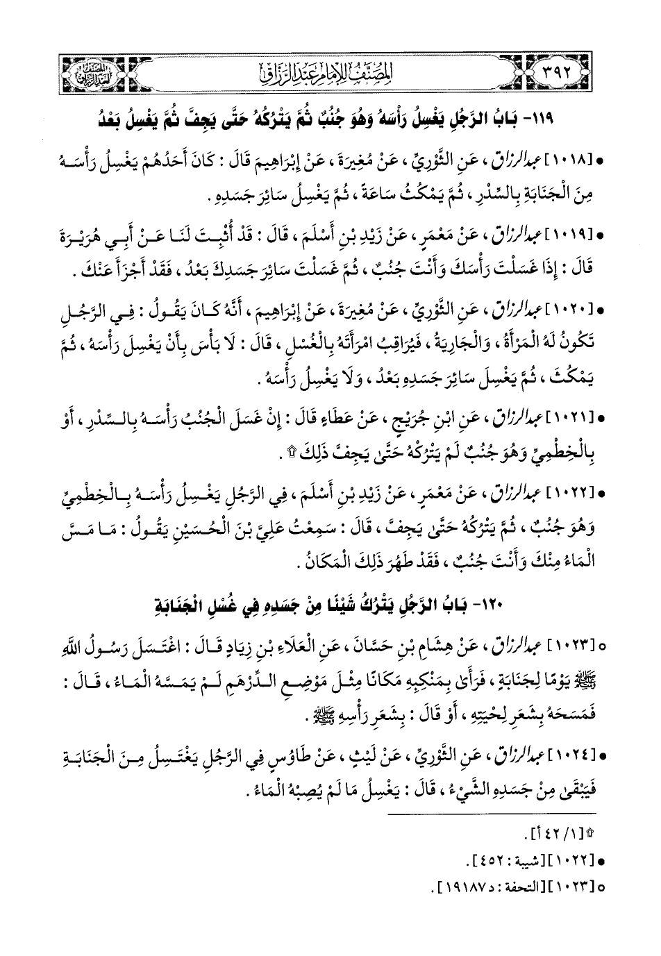 1022- عبد الرزاق، عَنْ مَعْمَرٍ، عَن زَيْدِ بْنِ أَسْلَمَ، فِي الرَّجُلِ يَغْسِلُ رَأْسَهُ بِالْخِطْمِيِّ وَهُوَ جُنُبٌ، ثُمَّ يَتْرُكُهُ، حَتَّى يَجِفَّ، قَالَ: سَمِعْتُ عَلِيَّ بن الْحُسَيْنِ يَقُولُ: مَا مَسَّ المَاءُ مِنْكَ وَأَنْتَ جُنُبٌ فَقَدْ طَهُرَ ذَلِكَ المَكَانُ.