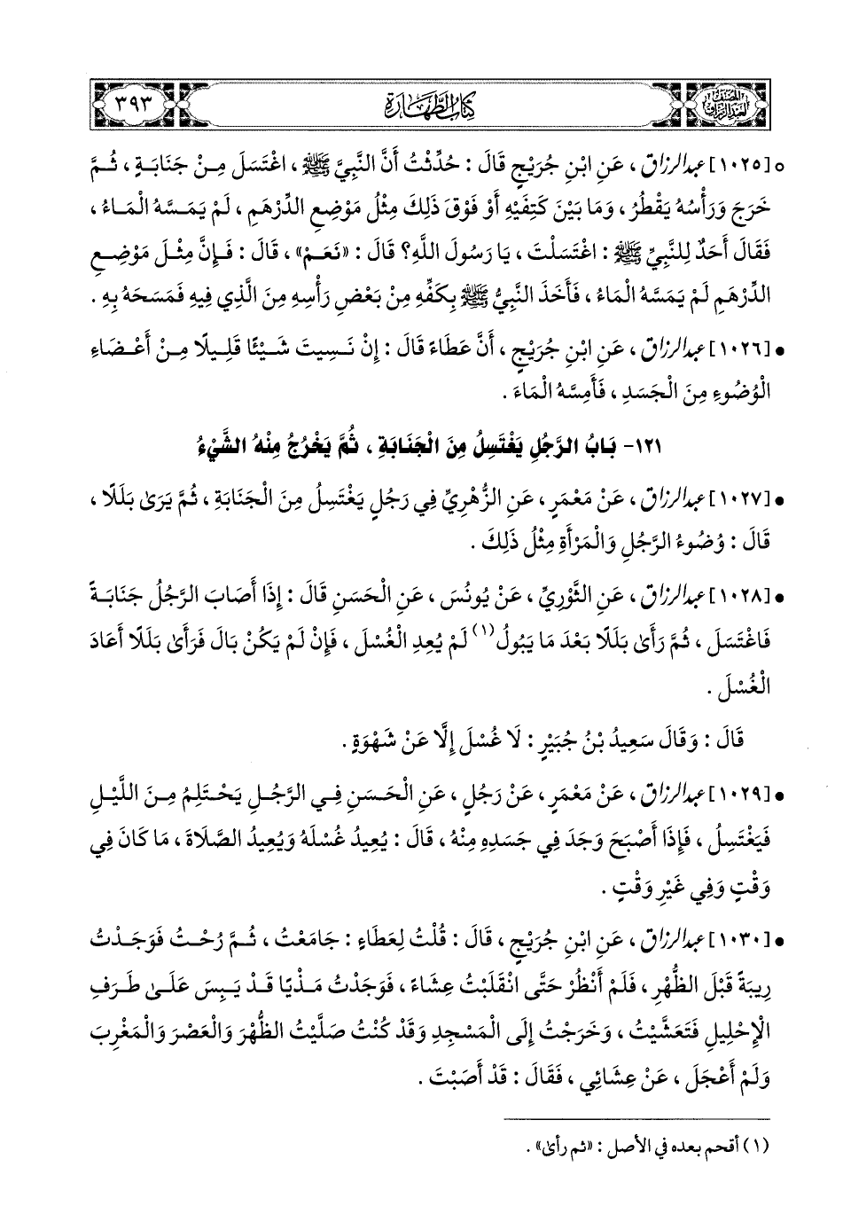 1025- عبد الرزاق، عَنِ ابْنِ جُرَيْجٍ، قَالَ: حُدِّثْتُ أَنَّ النَّبِيَّ صَلَّى اللهُ عَلَيْهِ وَسَلَّمَ اغْتَسَلَ مِنْ جَنَابَةٍ، ثُمَّ خَرَجَ وَرَأْسُهُ يَقْطُرُ، وَمَا بَيْنَ كَتِفَيْهِ، أَوْ فَوْقَ ذَلِكَ مِثْلُ مَوْضِعِ الدِّرْهَمِ لَمْ يَمَسَّهُ المَاءُ، فَقَالَ أَحَدٌ لِلنَّبِيِّ صَلَّى اللهُ عَلَيْهِ وَسَلَّمَ: اغْتَسَلْتَ يَا رَسُولَ اللهِ؟ قَالَ: نَعَمْ، قَالَ: فَإِنَّ مِثْلَ مَوْضِعِ الدِّرْهَمِ لَمْ يَمَسَّهُ المَاءُ، فَأَخَذَ النَّبِيُّ صَلَّى اللهُ عَلَيْهِ وَسَلَّمَ بِكَفِّهِ مِنْ بَعْضِ رَأْسِهِ مِنَ الَّذِي فِيهِ، فَمَسَحَهُ بِهِ.