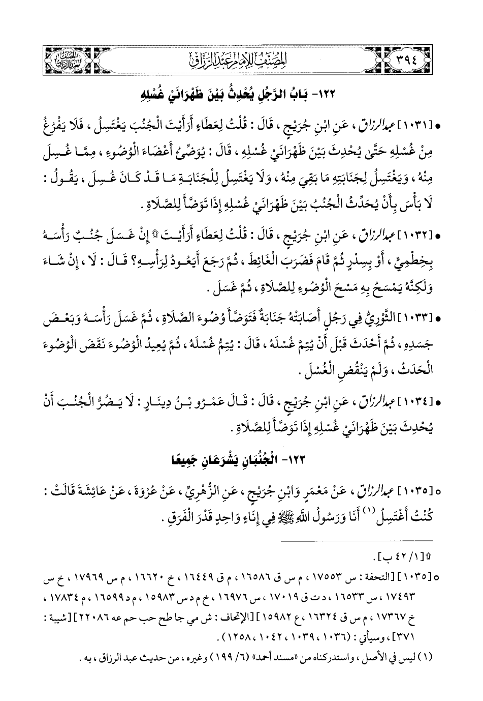1034- عبد الرزاق، عَنِ ابْنِ جُرَيْجٍ، قَالَ: قَالَ عَمْرُو بن دِينَارٍ: لاَ يَضُرُّ الْجُنُبَ أَنْ يُحْدِثَ بَيْنَ ظَهْرَانَيْ غُسْلِهِ إِذَا تَوَضَّأَ لِلصَّلاَةِ.