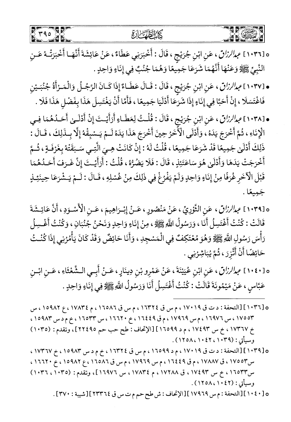 1039- عبد الرزاق، عَنِ الثَّورِيِّ، عَنْ مَنصُورٍ، عَن إِبرَاهِيمَ، عَنِ الأَسْوَدِ، أَنَّ عَائِشَةَ قَالَتْ: كُنْتُ أَغْتَسِلُ أَنَا وَرَسُولُ اللهِ صَلَّى اللهُ عَلَيْهِ وَسَلَّمَ مِنْ إِنَاءٍ وَاحِدٍ وَنَحْنُ جُنُبَانِ.