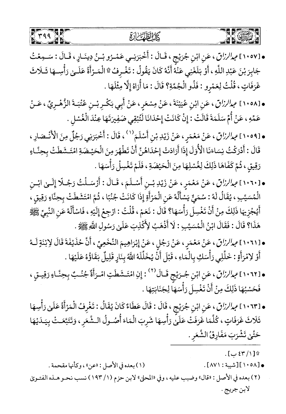 1059- عبد الرزاق، عَنْ مَعْمَرٍ، عَن زَيْدِ بْنِ أَسْلَمَ (1)، قَالَ: أَخْبَرَنِي رَجُلٌ مِنَ الأَنْصَارِ، قَالَ: أَدْرَكْتُ نِسَاءَنَا الأُوَلَ إِذَا أَرَادَتْ إِحْدَاهُنَّ أَنْ تَطْهُرَ مِنَ الْحَيْضَةِ، امْتَشَطَتْ بِحِنَّاءٍ رَقِيقٍ، ثُمَّ كَفَاهَا ذَلِكَ لِغُسْلِهَا مِنَ الْحَيْضَةِ، فَلَمْ تَغْسِلْ رَأْسَهَا.