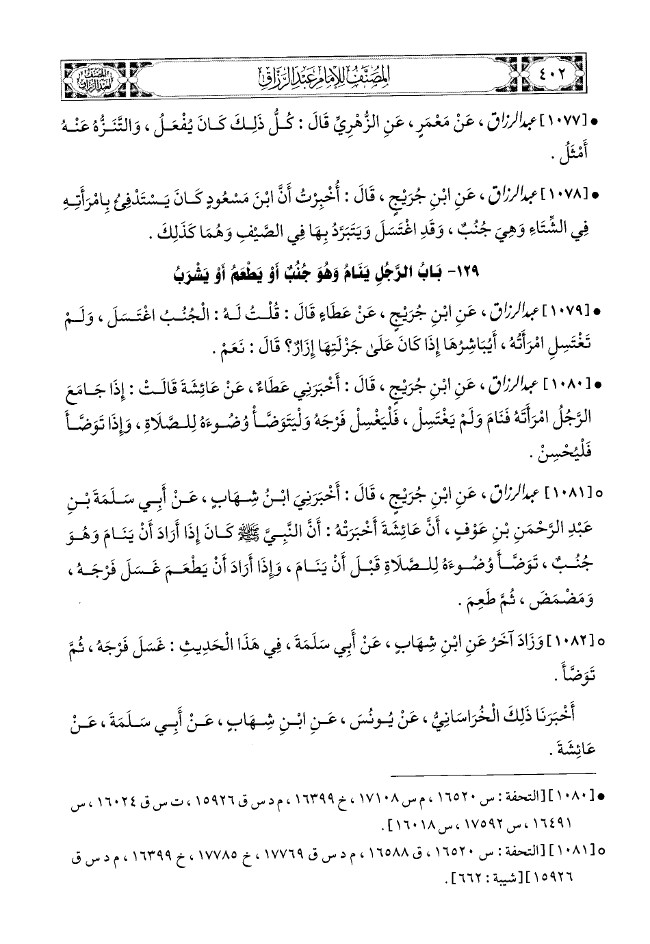 1081- عبد الرزاق، عَنِ ابْنِ جُرَيْجٍ، قَالَ: أَخْبَرَنِي ابْنُ شِهَابٍ، عَنْ أَبِي سَلَمَةَ بْنِ عَبدِ الرَّحْمَنِ بْنِ عَوْفٍ، أَنَّ عَائِشَةَ أَخْبَرَتْهُ؛ أَنَّ النَّبِيَّ صَلَّى اللهُ عَلَيْهِ وَسَلَّمَ كَانَ إِذَا أَرَادَ أَنْ يَنَامَ وَهُوَ جُنُبٌ تَوَضَّأَ وُضُوءَهُ لِلصَّلاَةِ قَبْلَ أَنْ يَنَامَ، وَإِذَا أَرَادَ أَنْ يَطْعَمَ غَسَلَ فَرْجَهُ، وَمَضْمَضَ، ثُمَّ طَعِمَ.